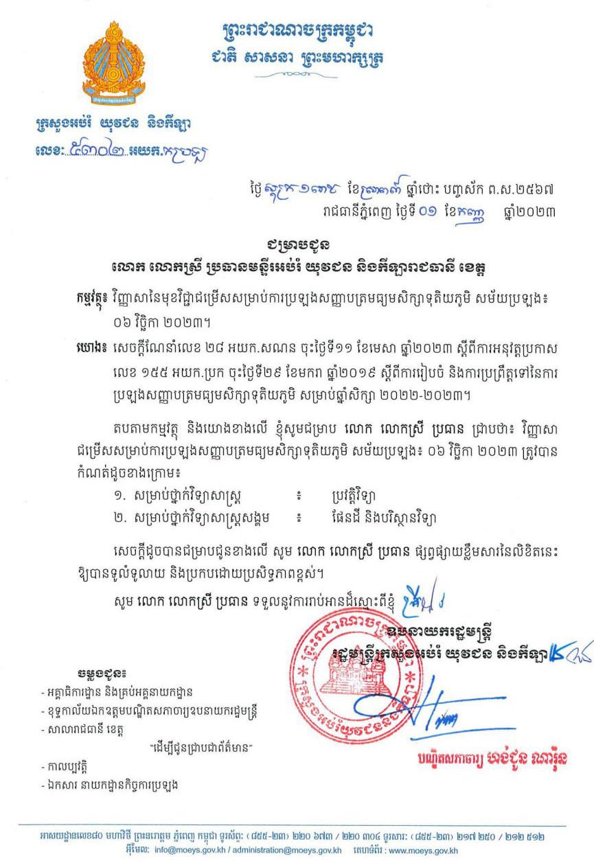 វិញ្ញាសាជម្រើសសម្រាប់ការប្រឡងសញ្ញាបត្រមធ្យមសិក្សាទុតិយភូមិ សម័យប្រឡង៖ ០៦ វិច្ឆិកា ២០២៣ ត្រូវបានកំណត់ដូចខាងក្រោម៖