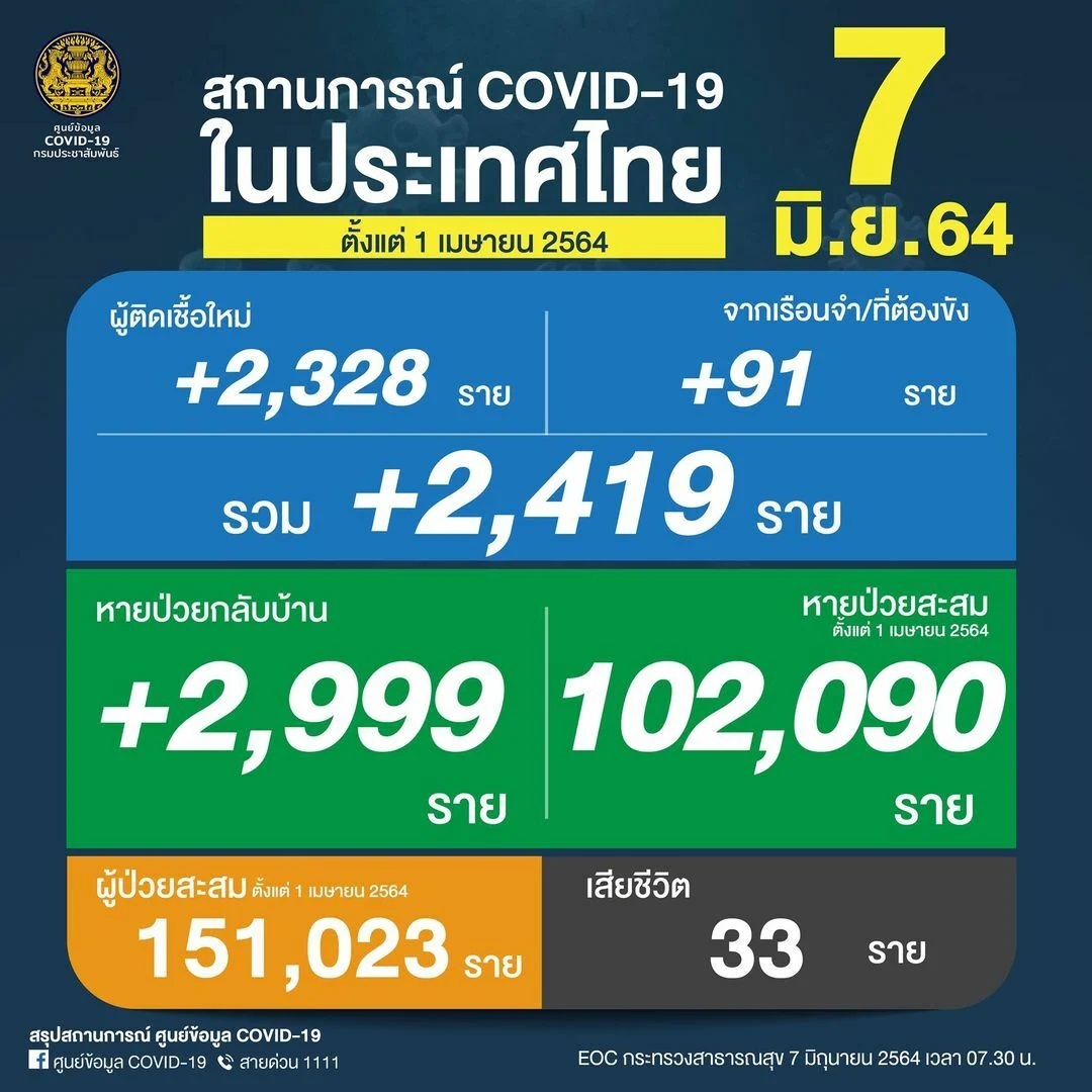 ថៃ៖ យោងតាមការចុះផ្សាយនៅក្នុងសារព័ត៌មាន បាងកកប៉ុស្តិ៍ បានឲ្យដឹងថា នៅក្នុងថ្ងៃចន្ទ ទី៧ ខែ មិថុនានេះ អាជ្ញាធរសុខាភិបាលនៃប្រទេសថៃបានរកឃើញអ្នកឆ្លងជំងឺកូវីដ ១៩ ថ្មីចំនួន ២,៤១៩នាក់បន្ថែមទៀត ខណៈអ្នកស្លាប់ដោយសារជំងឺកូវីដ ១៩ វិញគឺមានចំនួន ៣៣នាក់។