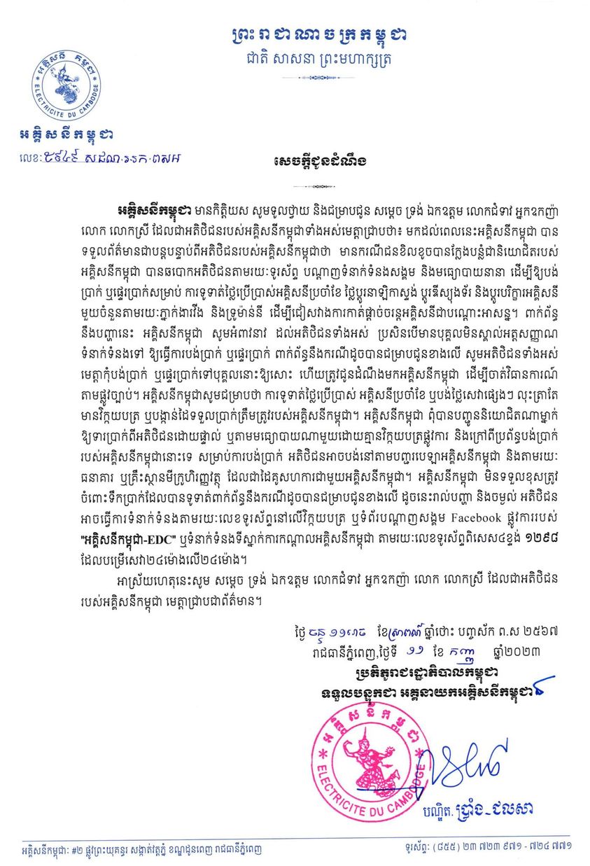 ខាងក្រោមនេះជាសេចក្តីជូនដំណឹងរបស់អគ្គិសនីកម្ពុជា៖