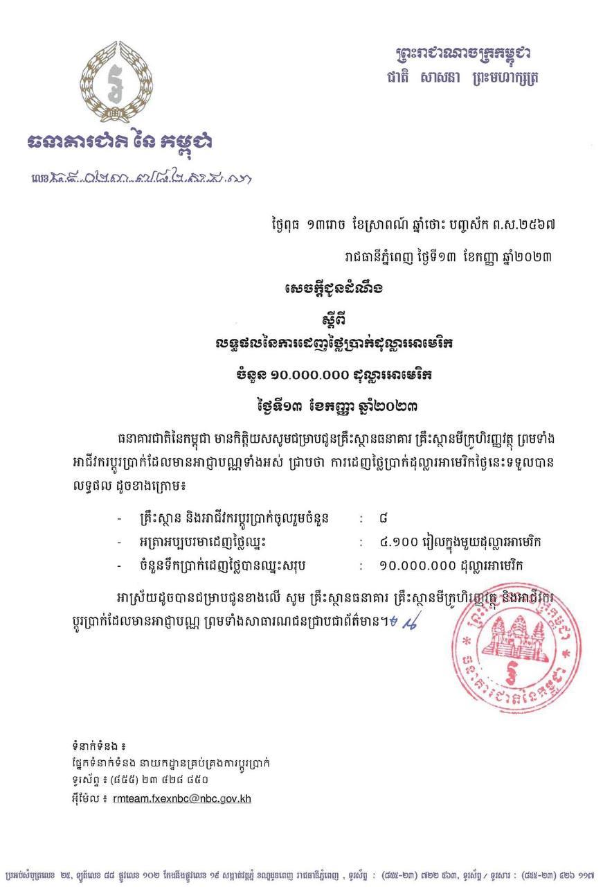 ធនាគារជាតិនៃកម្ពុជា បង្ហាញលទ្ធផលនៃការដេញថ្លៃប្រាក់ដុល្លារ លើកទី៣ ចំនួន ១០លានដុល្លារ