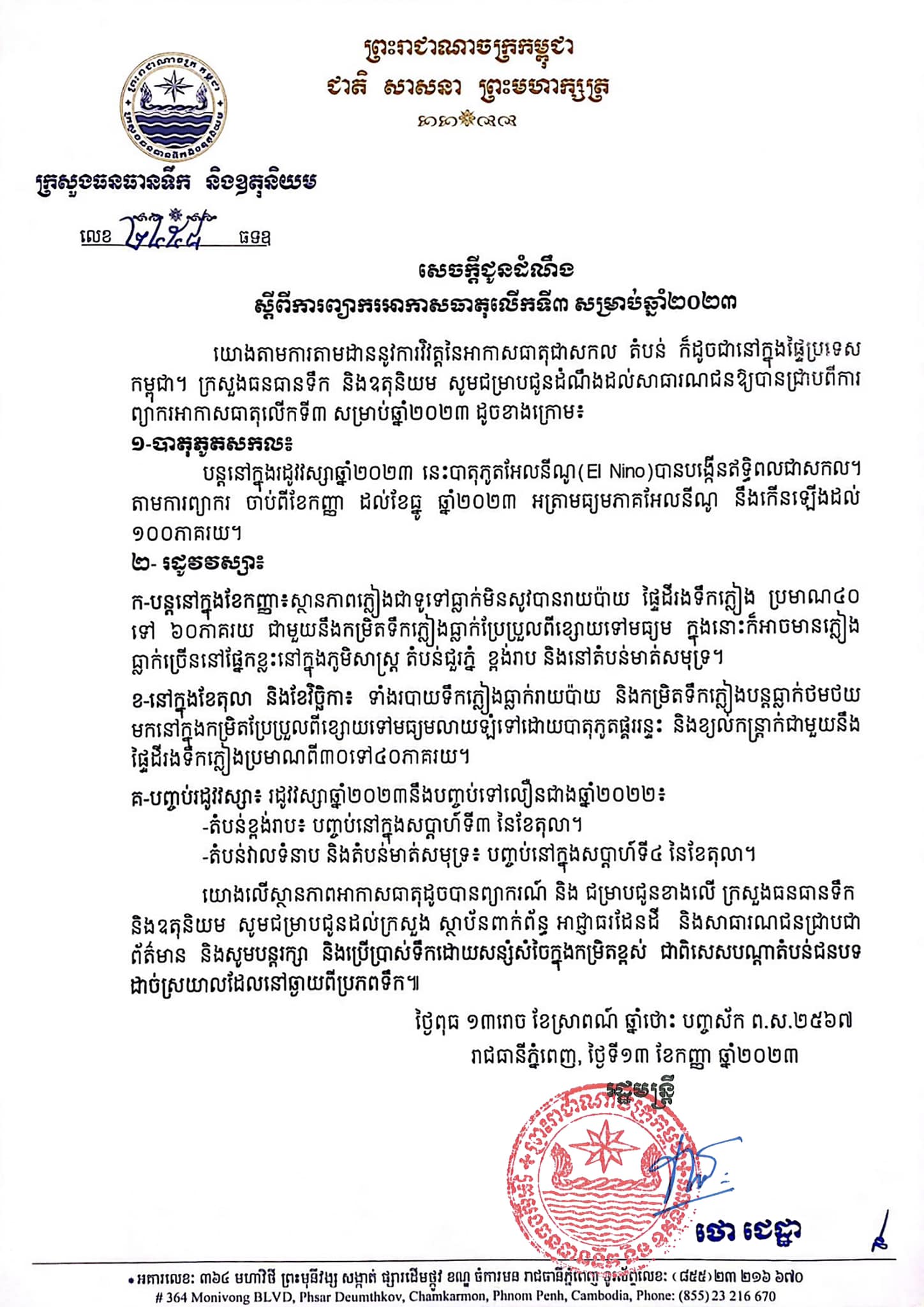 (ភ្នំពេញ)៖ ក្រសួងធនធានទឹក និងឧតុនិយម នាថ្ងៃទី១៣ ខែកញ្ញានេះ បានចេញសេចក្ដីជូនដំណឹងស្ដីពីការព្យាករអាកាសធាតុលើកទី៣ ឆ្នាំ២០២៣ ក្នុងនោះក្រសួងបានបញ្ជាក់ថា ចាប់ពីខែកញ្ញាដល់ខែធ្នូ ឆ្នាំ២០២៣ បាតុភូតអែលនីណូនឹងបង្កើនឥទ្ធិពលជាសកលឡើងដល់ ១០០% ខណៈរដូវវស្សាឆ្នាំ២០២៣ នឹងបញ្ចប់ទៅលឿនជាងឆ្នាំមុន៕