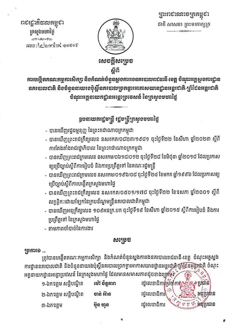 រដ្ឋមន្ត្រីក្រសួងមហាផ្ទៃ សម្រេចបង្កើតគណៈកម្មការសិក្សា និងកំណត់ចំនួនស្នងការរងនគរបាលរាជធានី-ខេត្ត និងចំនួននាយរងប៉ុស្តិ៍នគរបាលច្រកទ្វារអាកាសយានដ្ឋានអន្តរជាតិ-ព្រំដែនអន្តរជាតិ
