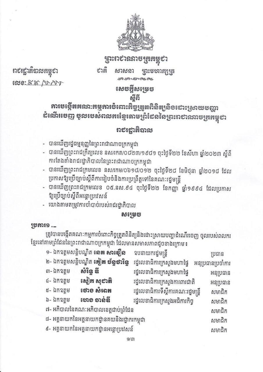 (ភ្នំពេញ)៖ សម្ដេចមហាបវរធិបតី ហ៊ុន ម៉ាណែត នាយករដ្ឋមន្ដ្រីនៃកម្ពុជា បានចេញសេចក្ដីសម្រេចបង្កើតគណៈកម្មការចំពោះកិច្ចត្រួតពិនិត្យ និងដោះស្រាយបញ្ហាដំណើរចេញ ចូលរបស់ពលករខ្មែរតាមព្រំដែនកម្ពុជា។