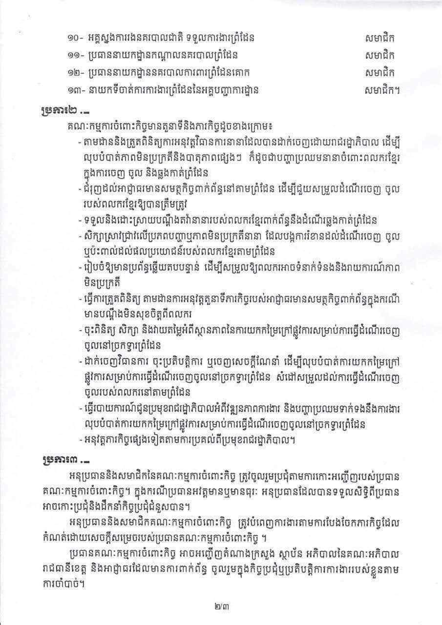* ដាក់ចេញវិធានការ ចុះប្រតិបត្តិការ ឬចេញសេចក្ដីណែនាំ ដើម្បីលុបបំបាត់ការយកកម្រៃក្រៅ ផ្លូវការសម្រាប់ការធ្វើដំណើរចេញចូលនៅច្រកទ្វារព្រំដែន សំដៅសម្រួលដល់ការធ្វើដំណើរចេញ ចូលរបស់ពលករនៅតាមព្រំដែន