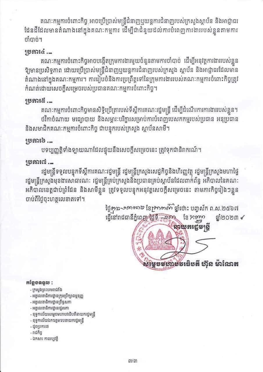 ក្នុងសេចក្ដីសម្រេចដែលចុះហត្ថលេខានៅថ្ងៃទី១៣ ខែកញ្ញា ឆ្នាំ២០២៣ ហើយបណ្ដាញព័ត៌មាន Fresh News ទទួលបាននៅព្រឹកថ្ងៃទី១៤ ខែកញ្ញានេះ បានឲ្យដឹងថា គណៈកម្មការចំពោះកិច្ចនេះ មានលោកសន្ដិបណ្ឌិត នេត សាវឿន ឧបនាយករដ្ឋមន្ដ្រី ជាប្រធាន អមដោយអនុប្រធានប្រចាំការ១រូប អនុប្រធាន២រូប និងសមាជិកជាច្រើនរូបផ្សេងទៀត។