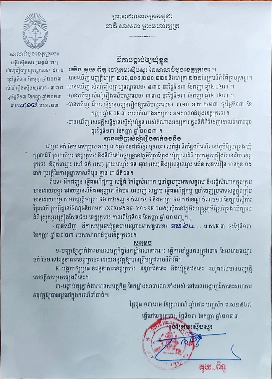 ជនសង្ស័យរូបនោះមានឈ្មោះ ចក់ ចែម ជាមេឈ្មួញលក់សត្វព្រៃយ៉ាងសកម្ម នៅភូមិសាស្រ្តភូមិស្រែត្រែង ឃុំក្បាលដំរី ស្រុកអូរគ្រៀងសែនជ័យ ខេត្តក្រចេះ។ ការឃុំខ្លួននេះធ្វើឡើងតាមសាលដីការបស់លោក គុយ ពិទូ ចៅក្រមស៊ើបសួរសាលាដំបូងខេត្តក្រចេះ នាថ្ងៃទី១៣ ខែកញ្ញា ឆ្នាំ២០២៣។
