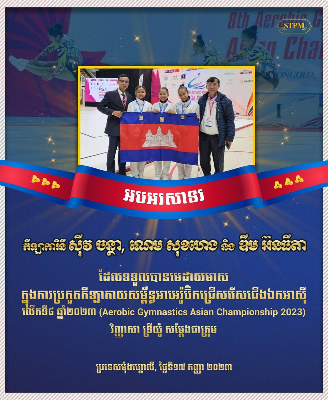 (ភ្នំពេញ)៖ សម្តេចធិបតី ហ៊ុន ម៉ាណែត នាយករដ្ឋមន្ត្រីកម្ពុជា បានអបអរសាទរ កីឡាការិនី ស៉ីវ ចន្ថា, ណេម សុខហេង និង ឌឹម អ៊នធីតា ដែលទទួលបានមេដាយមាស ក្នុងការប្រកួតកីឡាកាយសម្ព័ន្ធអាអេរ៉ូប៊ិក ជ្រើសរើសជើងឯកអាស៉ីលើកទី៨ ឆ្នាំ២០២៣ (Aerobic Gymnastics Asian Championship 2023) លើវិញ្ញាសា ទ្រីយ៉ូ សម្តែងជាក្រុម។ ការប្រកួតនេះ បានធ្វើឡើងប្រទេសម៉ុងហ្គោលី នៅថ្ងៃទី១៧ កញ្ញា ២០២៣៕