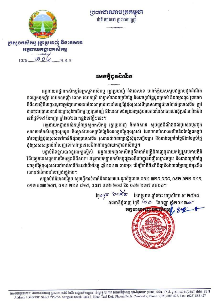 (ភ្នំពេញ)៖ អគ្គនាយកដ្ឋានកសិកម្ម នៃក្រសួងកសិកម្ម រុក្ខាប្រមាញ់ និងនេសាទ បានចេញសេចក្តីជូនដំណឹង អំពាវនាវដល់ម្ចាស់ចម្ការដូង សហគមន៍កសិកម្មដូងក្រអូប និងម្ចាស់រោងចក្រកែច្នៃ និងវេចខ្ចប់ផ្លែដូងស្រស់ ដែលមានបំណងផលិត និងកែច្នៃវេចខ្ចប់នាំចេញផ្លែដូងស្រស់ទៅកាន់ទីផ្សារប្រទេសចិន សូមមកដាក់ពាក្យស្នើសុំចុះបញ្ជីចម្ការ និងរោងចក្រកែច្នៃ និងវេចខ្ចប់ផ្លែដូងស្រស់ សម្រាប់នាំចេញទៅកាន់ប្រទេសចិន។