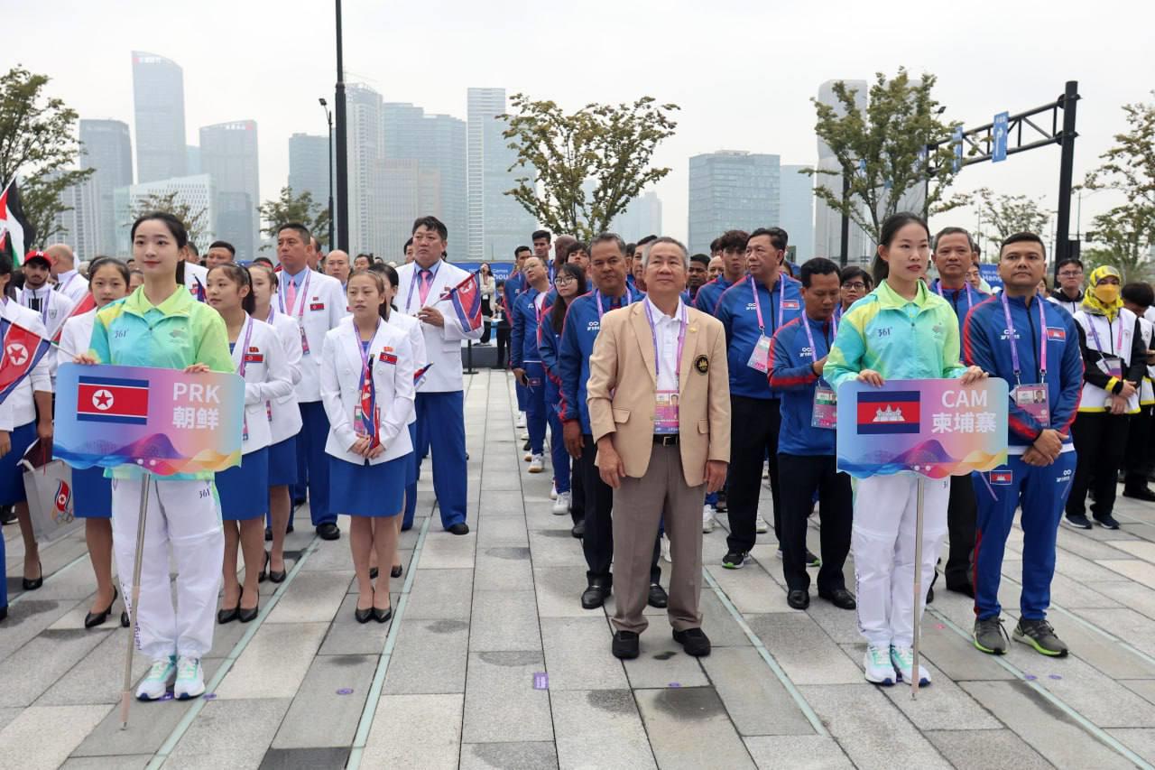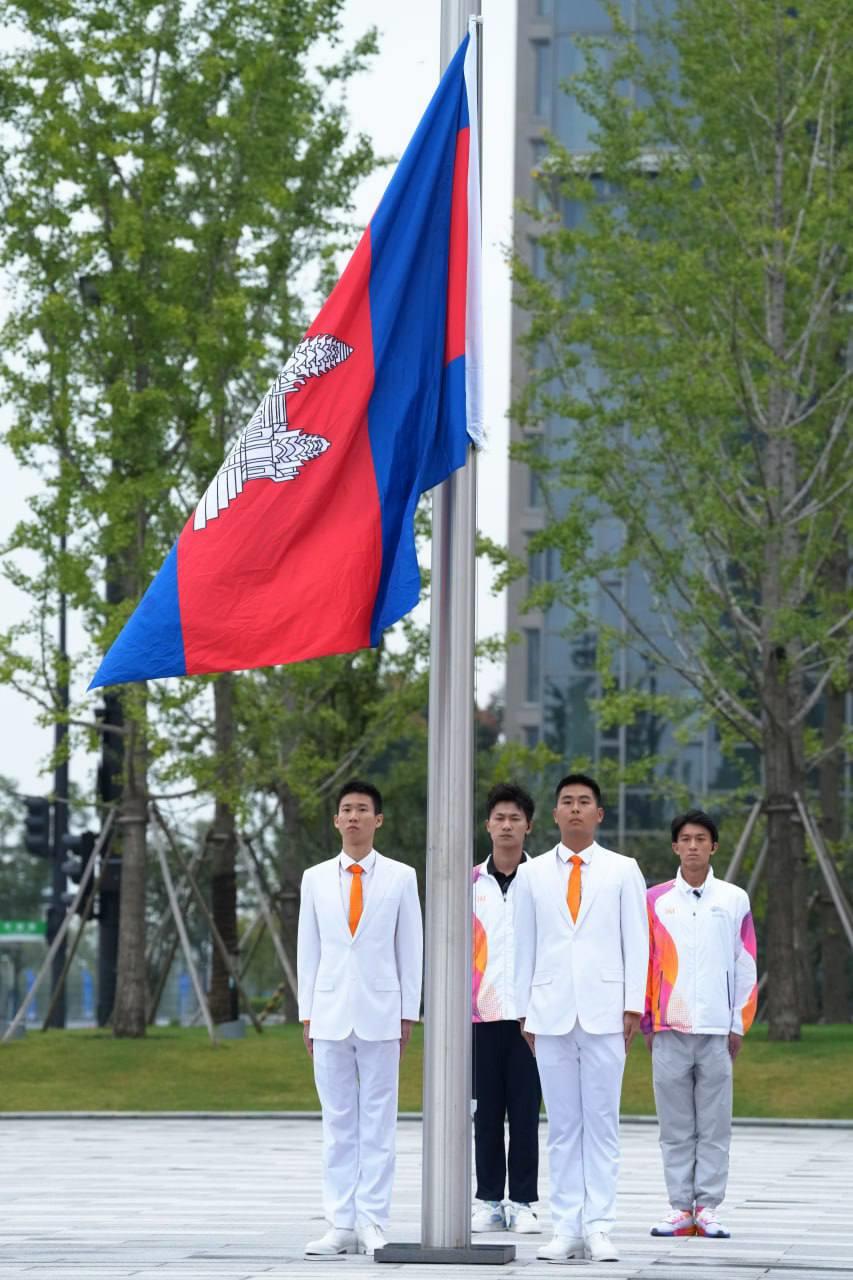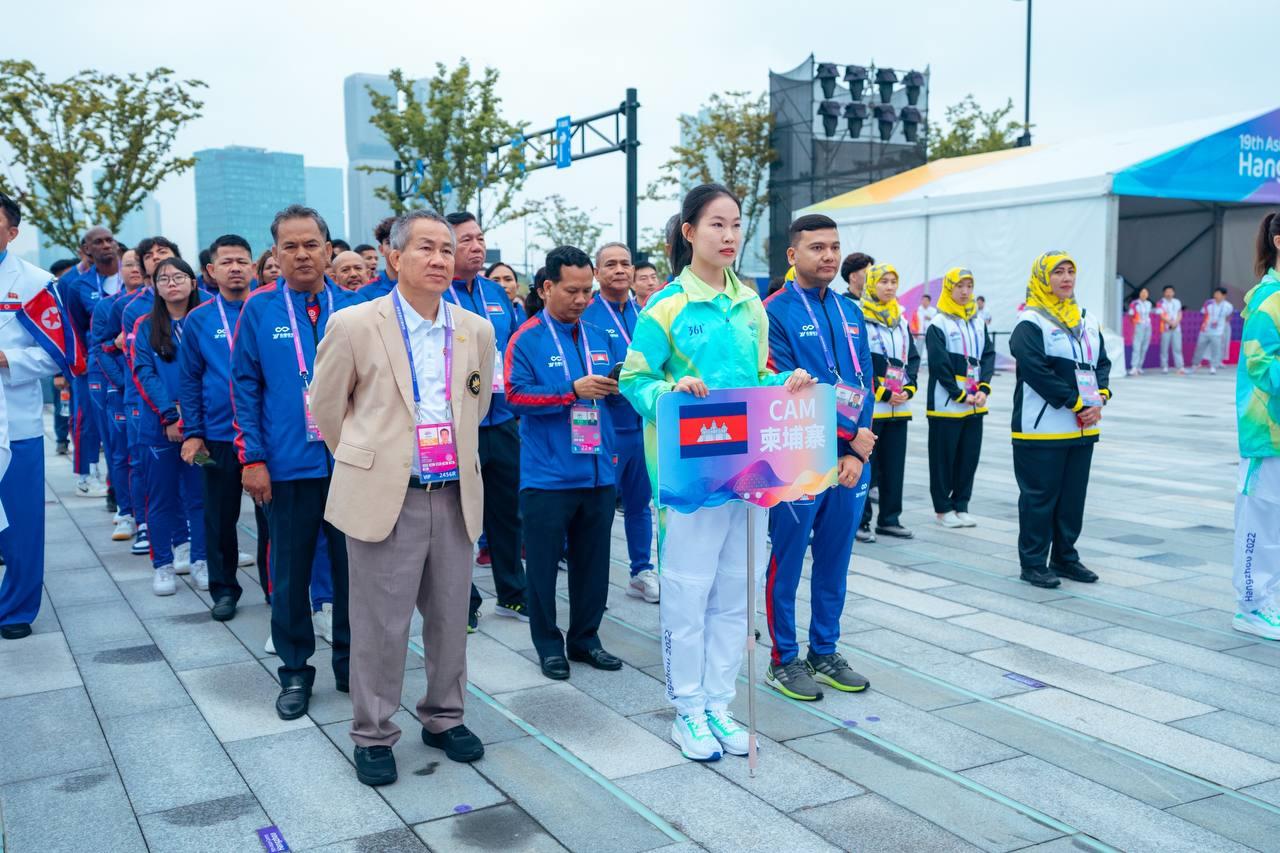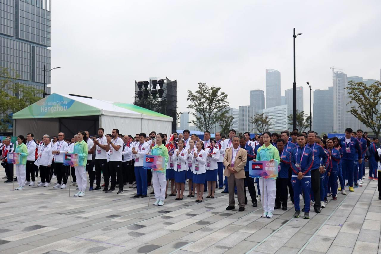 លោក វ៉ាត់ ចំរើន បានឲ្យដឹងពីទីក្រុង Hangzhou នៅព្រឹកថ្ងៃសុក្រនេះថា ដើម្បីបញ្ជាក់ពីការទៅដល់ភូមិកីឡា ក៏ដូចជាទីតាំងប្រកួត ព្រឹកនេះ ប្រតិភូកីឡាជាន់ខ្ពស់កម្ពុជា បានរៀបចំពិធីបង្ហូតទង់ជាតិរបស់ខ្លួន ជាមួយបណ្ដាប្រទេសផ្សេងៗនៅភូមិកីឡា ដោយអនុវត្តពិធីបង្ហូតទង់ជាតិ ចំនួន ៦ប្រទេសម្ដង ខណៈកម្ពុជា ត្រូវបានប្រារព្ធពិធីបង្ហូតទង់ជាតិ ជាមួយ ៥ប្រទេសផ្សេងទៀត រួមមានប្រ៊ុយណេ ថៃ កូរ៉េខាងជើង ឆាយនីសតៃប៉ិ និងប្រតិភូកីឡាប៉ាឡេស្ទីន ។