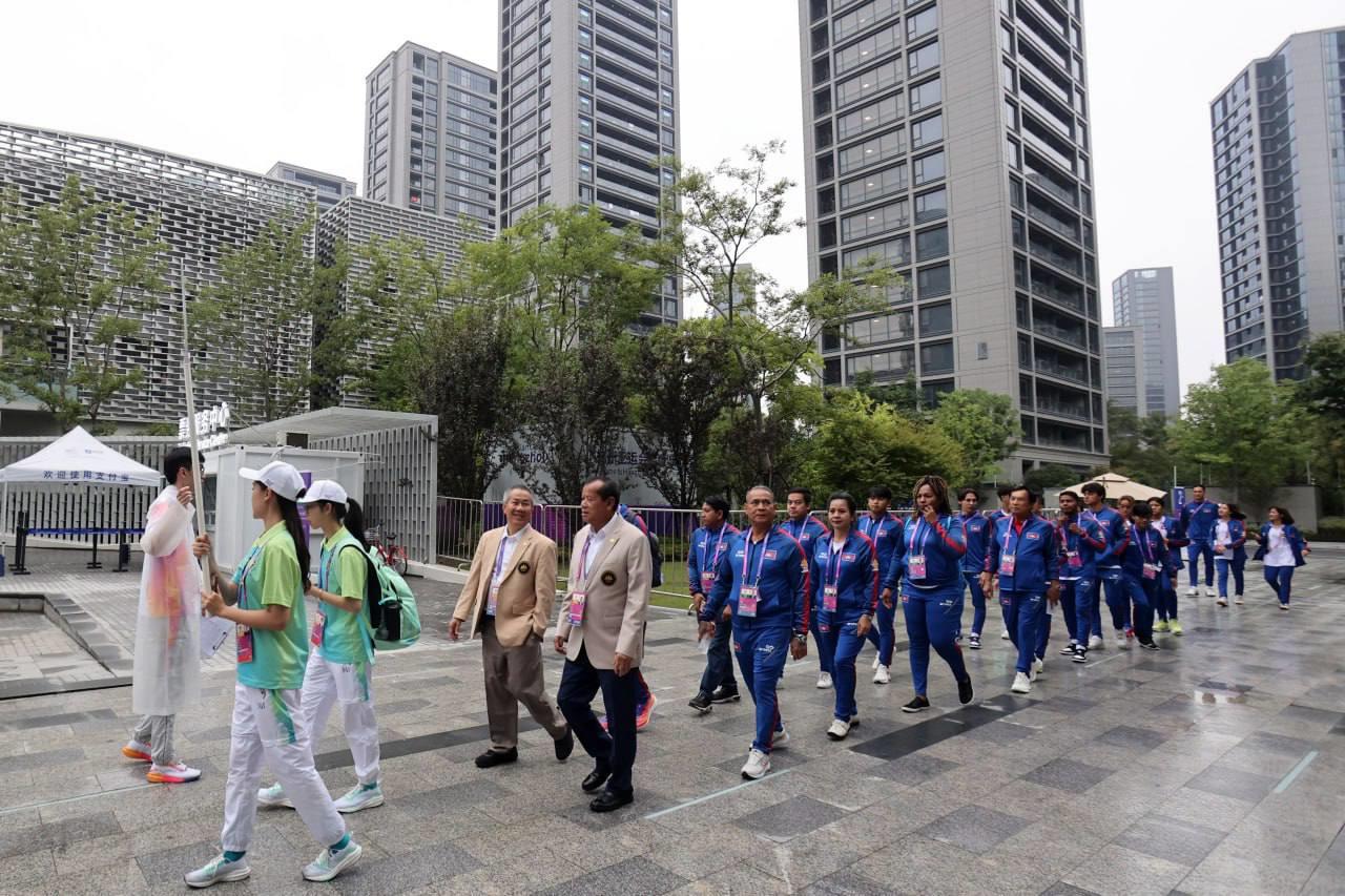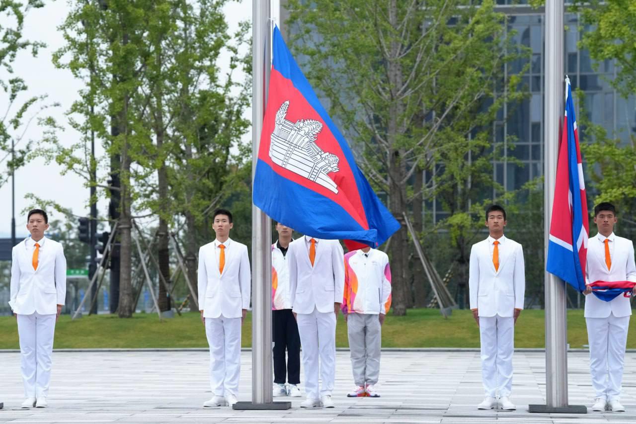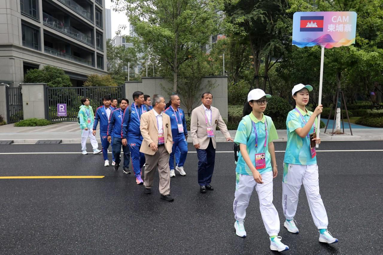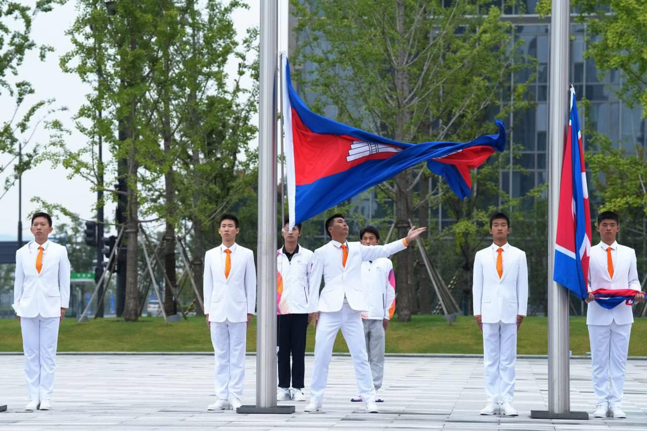 លោក វ៉ាត់ ចំរើន បានឲ្យដឹងពីទីក្រុង Hangzhou នៅព្រឹកថ្ងៃសុក្រនេះថា ដើម្បីបញ្ជាក់ពីការទៅដល់ភូមិកីឡា ក៏ដូចជាទីតាំងប្រកួត ព្រឹកនេះ ប្រតិភូកីឡាជាន់ខ្ពស់កម្ពុជា បានរៀបចំពិធីបង្ហូតទង់ជាតិរបស់ខ្លួន ជាមួយបណ្ដាប្រទេសផ្សេងៗនៅភូមិកីឡា ដោយអនុវត្តពិធីបង្ហូតទង់ជាតិ ចំនួន ៦ប្រទេសម្ដង ខណៈកម្ពុជា ត្រូវបានប្រារព្ធពិធីបង្ហូតទង់ជាតិ ជាមួយ ៥ប្រទេសផ្សេងទៀត រួមមានប្រ៊ុយណេ ថៃ កូរ៉េខាងជើង ឆាយនីសតៃប៉ិ និងប្រតិភូកីឡាប៉ាឡេស្ទីន ។