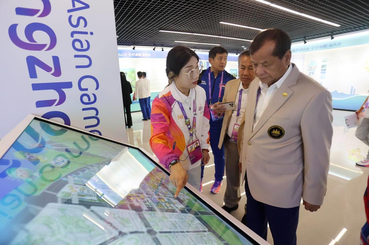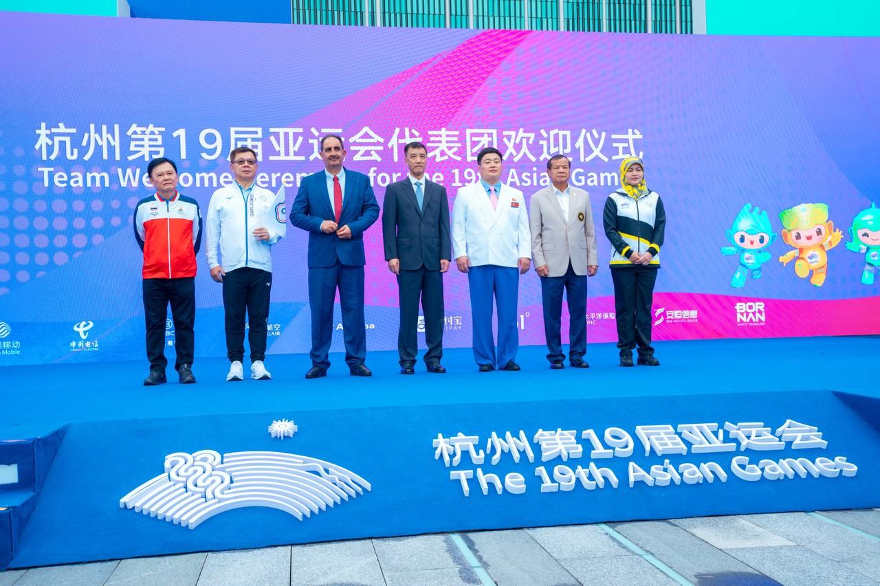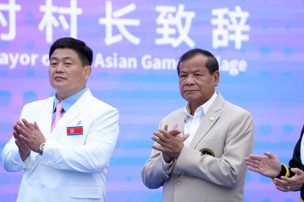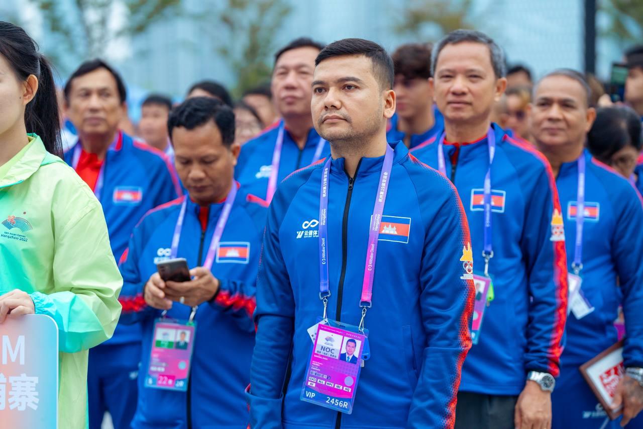 លោក វ៉ាត់ ចំរើន បានឲ្យដឹងពីទីក្រុង Hangzhou នៅព្រឹកថ្ងៃសុក្រនេះថា ដើម្បីបញ្ជាក់ពីការទៅដល់ភូមិកីឡា ក៏ដូចជាទីតាំងប្រកួត ព្រឹកនេះ ប្រតិភូកីឡាជាន់ខ្ពស់កម្ពុជា បានរៀបចំពិធីបង្ហូតទង់ជាតិរបស់ខ្លួន ជាមួយបណ្ដាប្រទេសផ្សេងៗនៅភូមិកីឡា ដោយអនុវត្តពិធីបង្ហូតទង់ជាតិ ចំនួន ៦ប្រទេសម្ដង ខណៈកម្ពុជា ត្រូវបានប្រារព្ធពិធីបង្ហូតទង់ជាតិ ជាមួយ ៥ប្រទេសផ្សេងទៀត រួមមានប្រ៊ុយណេ ថៃ កូរ៉េខាងជើង ឆាយនីសតៃប៉ិ និងប្រតិភូកីឡាប៉ាឡេស្ទីន ។