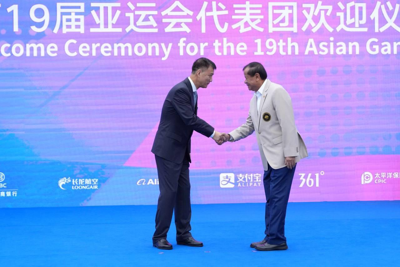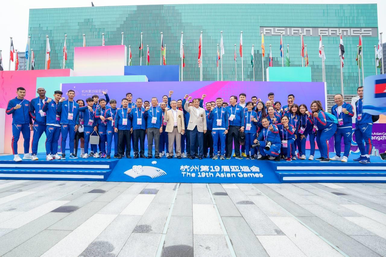 (ហាំងចូវ)៖ នៅព្រឹកថ្ងៃទី២២ ខែកញ្ញានេះ លោកបណ្ឌិត ថោង ខុន ទេសរដ្ឋមន្ដ្រី និងជាប្រធានគណៈកម្មាធិការជាតិអូឡាំពិកកម្ពុជា (NOCC) ក្នុងនាមប្រធានប្រតិភូកីឡាកម្ពុជា បានដឹកនាំគណៈប្រតិភូកីឡាកម្ពុជា អមដំណើរដោយលោក វ៉ាត់ ចំរើន រដ្ឋលេខាធិការក្រសួងអប់រំ យុវជន និងកីឡា និងជាអគ្គលេខាធិការ NOCC ចូលរួមពិធីបង្ហូតទង់ជាតិ នៅភូមិកីឡា ដើម្បីបញ្ជាក់ពីវត្តមាន ក៏ដូចជាការត្រៀមខ្លួនរួចរាល់ ក្នុងការចូលរួមប្រកួតកីឡាអាស៊ី (Asian Games) លើកទី១៩ នៅប្រទេសចិន ចាប់ពីថ្ងៃទី២៣ ខែកញ្ញា ដល់ថ្ងៃទី០៨ ខែតុលា ឆ្នាំ២០២៣ ។