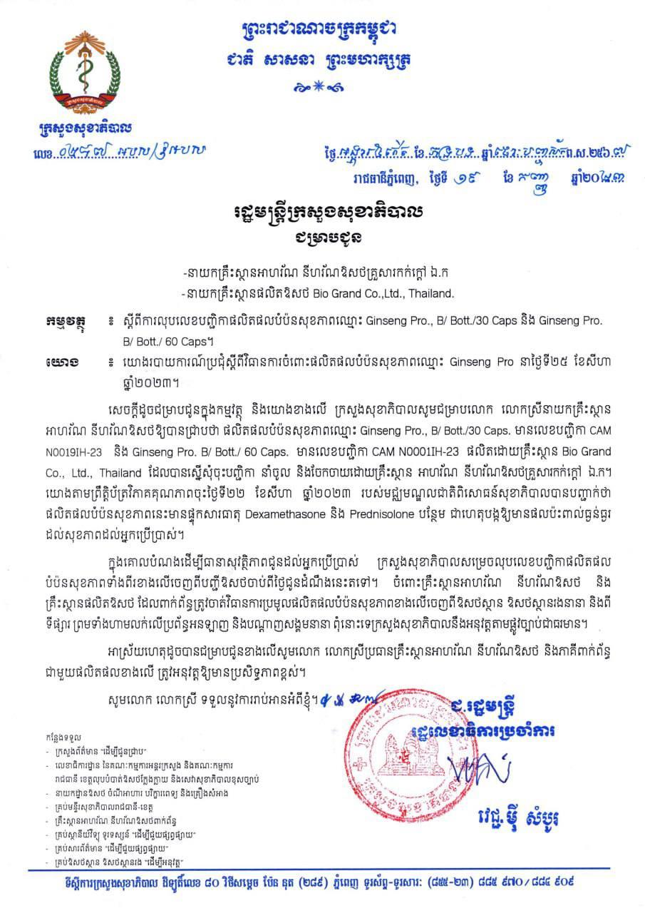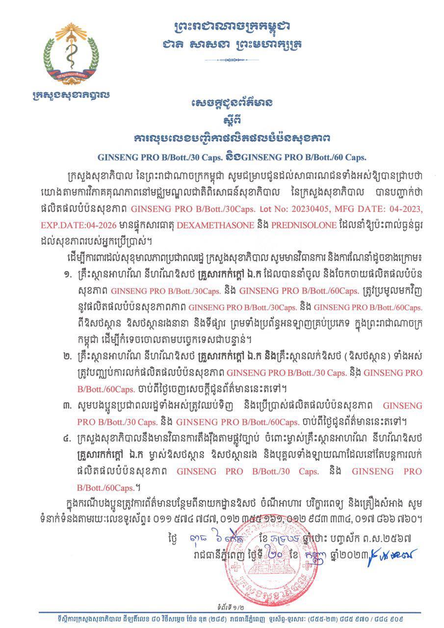 (ភ្នំពេញ)៖ ក្រសួងសុខាភិបាល បានហាមឃាត់ការលក់ចែកចាយផលិតផលបំប៉នសុខភាពឈ្មោះ Ginseng Pro., B/ Bott./30 Caps. របស់គ្រឹះស្ថានអាហរ័ណ នីហរ័ណឱសថ ដោយសារមជ្ឈមណ្ឌលជាតិពិសោធន៍សុខាភិបាលបញ្ជាក់ថា ផលិតផលបំប៉នសុខភាពនេះមានផ្ទុកសារធាតុ Dexamethasone និង Prednisolone បន្ថែម ជាហេតុបង្កឱ្យមានផលប៉ះពាល់ធ្ងន់ធ្ងរដល់សុខភាពដល់អ្នកប្រើប្រាស់។