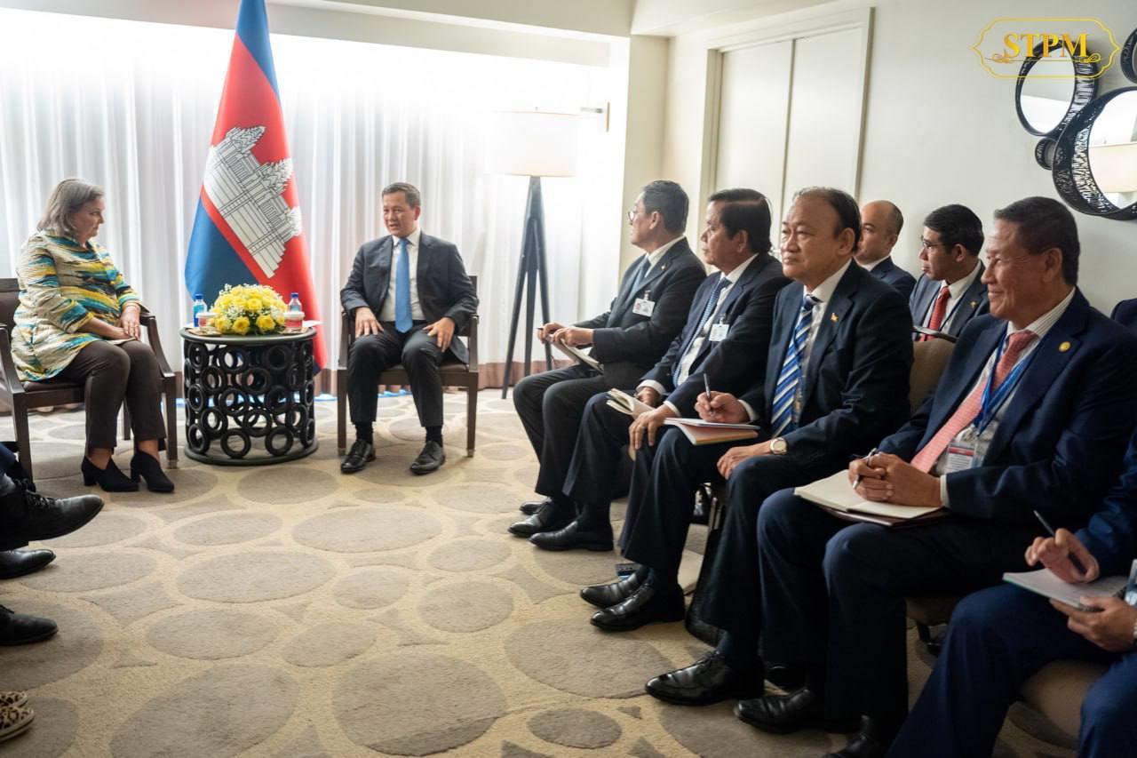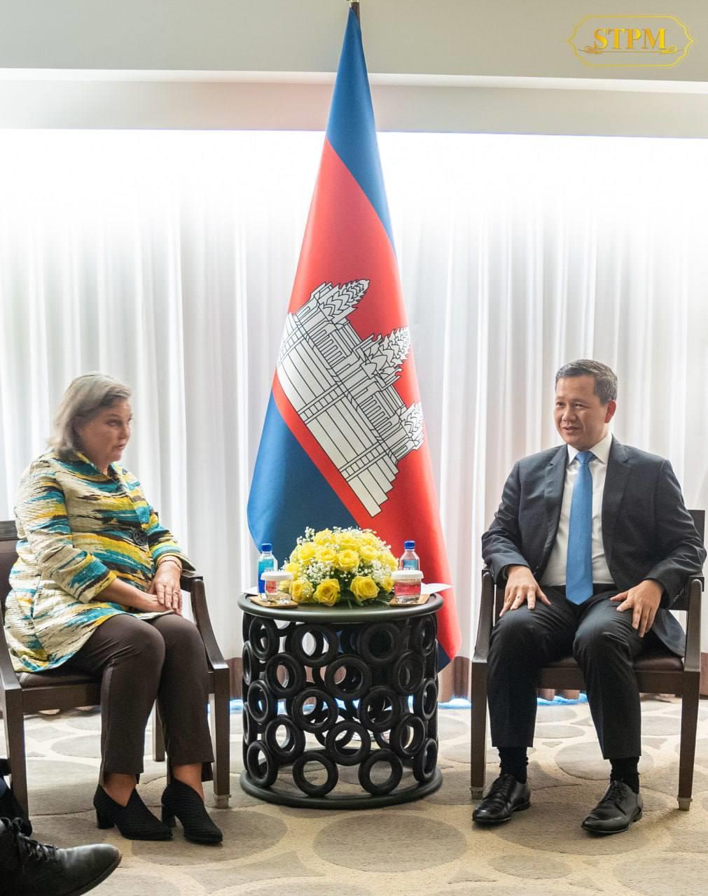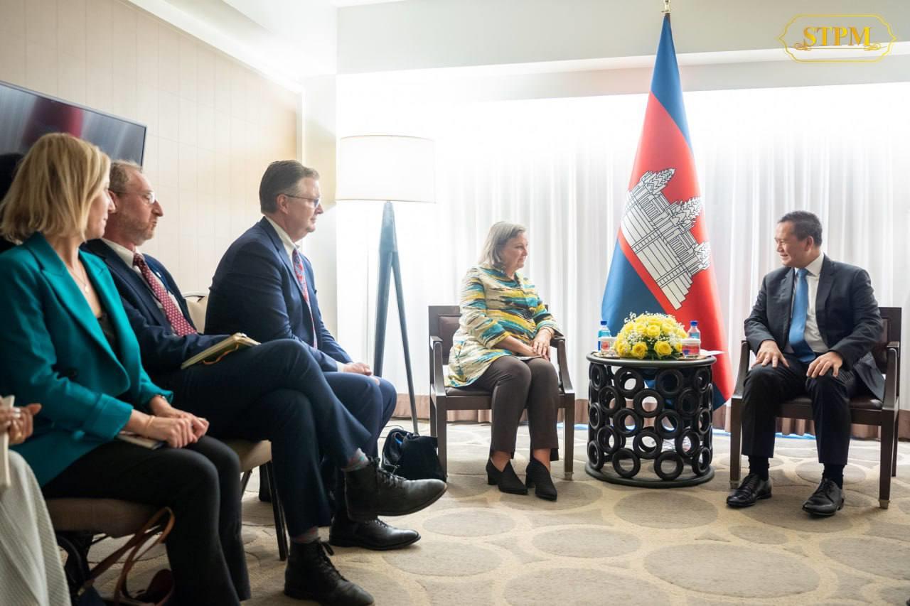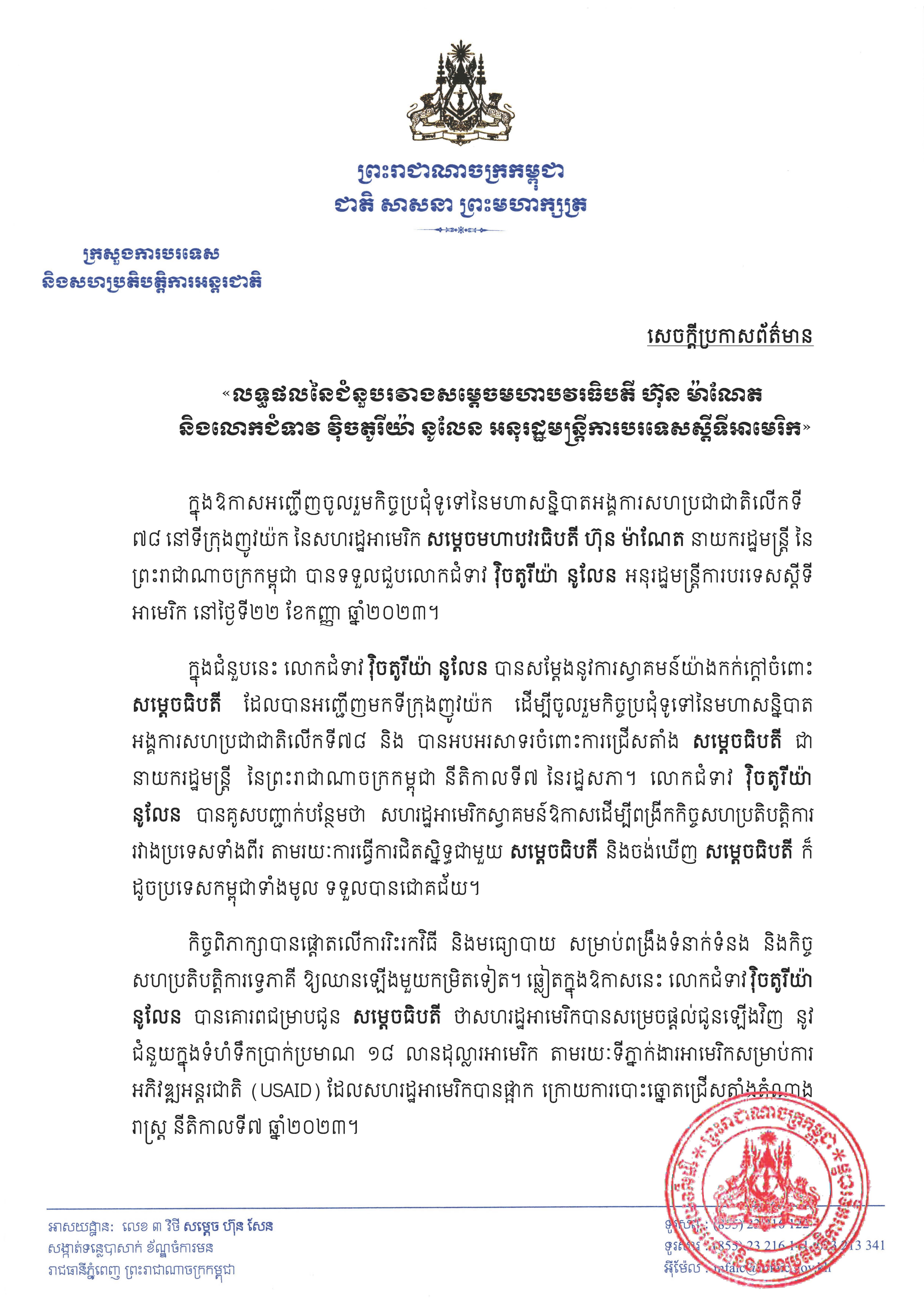 ក្នុងឱកាសអញ្ជើញចូលរួមកិច្ចប្រជុំទូទៅនៃមហាសន្និបាតអង្គការសហប្រជាជាតិលើកទី៧៨ នៅទីក្រុងញូវយ៉ក សហរដ្ឋអាមេរិក, សម្តេចមហាបវរធិបតី ហ៊ុន ម៉ាណែត បានទទួលជួបលោកស្រី វ៉ិចតូរីយ៉ា នូលែន អនុរដ្ឋមន្ត្រីការបរទេសស្តីទីអាមេរិក នៅថ្ងៃទី២២ ខែកញ្ញា ឆ្នាំ២០២៣។