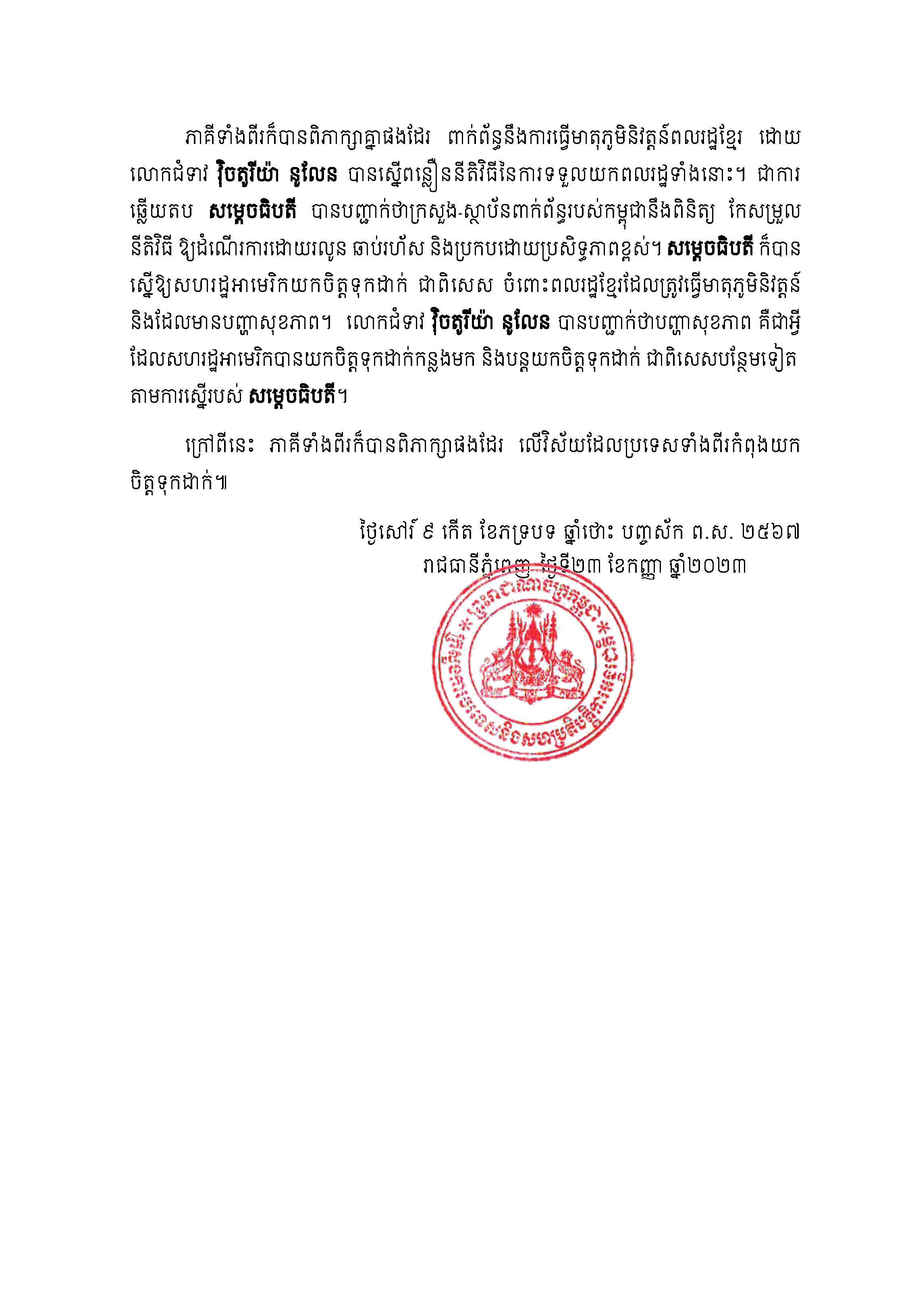 ឆ្លៀតក្នុងឱកាសនោះ លោកស្រី វ៉ិចតូរីយ៉ា នូលែន បានជម្រាបជូនសម្តេចធិបតីថាសហរដ្ឋអាមេរិកបានសម្រេចផ្តល់ជូនឡើងវិញ នូវជំនួយក្នុងទំហំទឹកប្រាក់ប្រមាណ១៨លានដុល្លារអាមេរិក តាមរយៈទីភ្នាក់ងារអាមេរិកសម្រាប់ការអភិវឌ្ឍអន្តរជាតិ (USAID) ដែលសហរដ្ឋអាមេរិកបានផ្អាក ក្រោយការបោះឆ្នោតជ្រើសតាំងតំណាងរាស្ត្រនីតិកាលទី៧ ឆ្នាំ២០២៣។