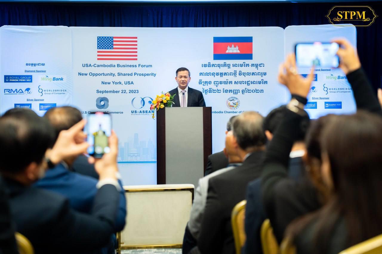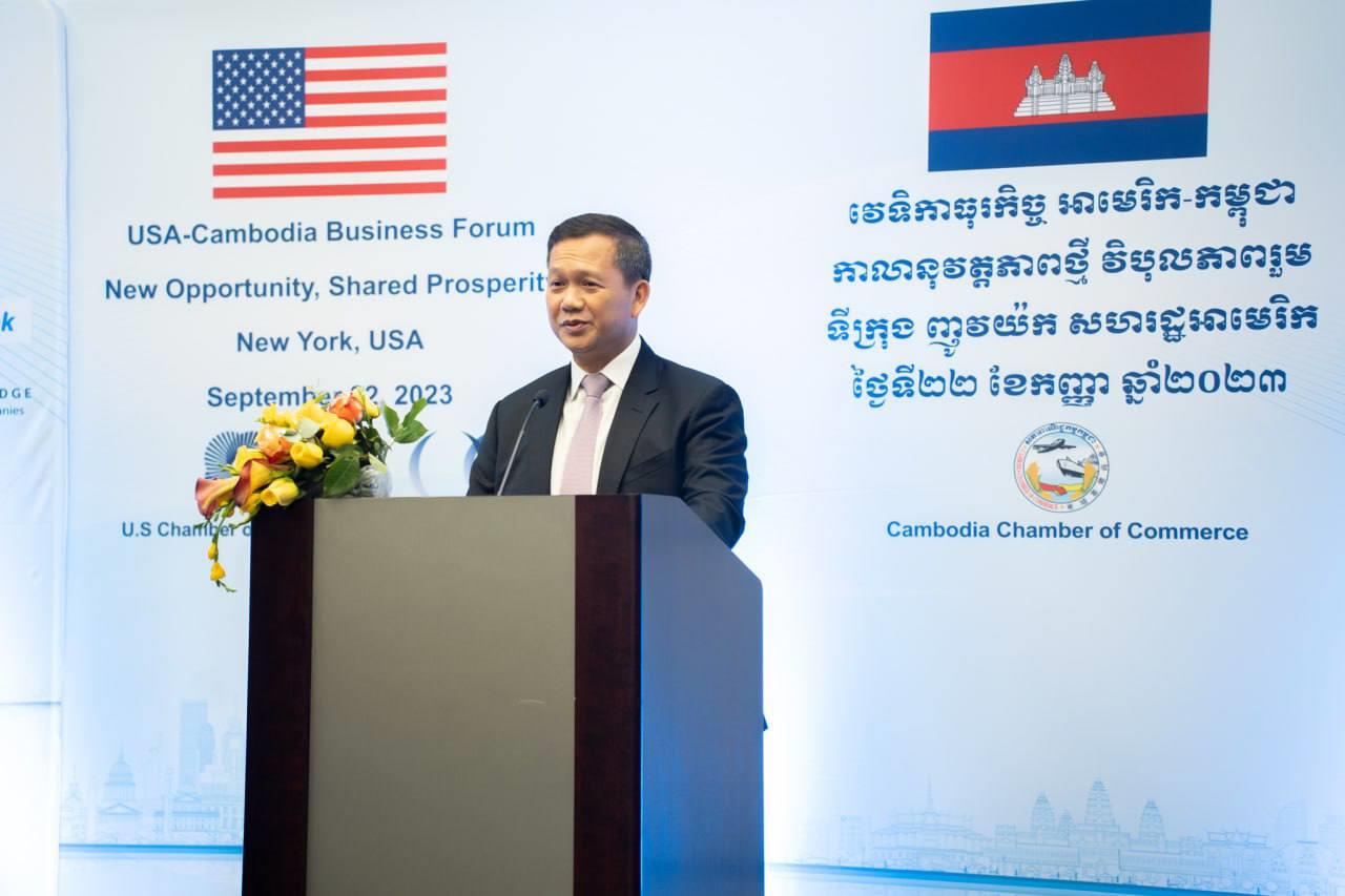 នាទីក្រុងញូវយ៉ក នាថ្ងៃសុក្រ ទី២២ ខែកញ្ញា ឆ្នាំ២០២៣ សម្តេចធិបតី ហ៊ុន ម៉ាណែត បានឆ្លៀតអញ្ជើញជាអធិបតីបើកវេទិកាធុរកិច្ចអាមេរិក-កម្ពុជា ដែលជាការរៀបចំឡើងរវាងសភាពាណិជ្ជកម្មអាមេរិក និងសភាពាណិជ្ជកម្មកម្ពុជា។ វេទិកានេះ រៀបចំឡើងដើម្បីជាការជួបគ្នារវាងធុរជនកម្ពុជា និងអាមេរិក ហើយសិក្សាពីគ្នា ស្វែងរកឱកាសសហការគ្នាបើកការវិនិយោគរវាងកម្ពុជា និងអាមេរិក។