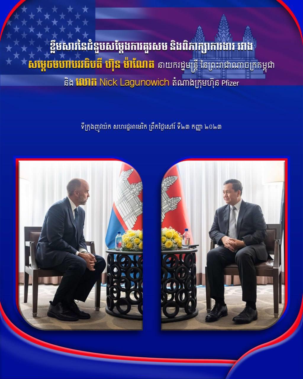 ខ្លឹមសារជំនួបដែលទើបផ្សព្វផ្សាយជាផ្លូវការ នៅថ្ងៃទី២៥ ខែកញ្ញា ឆ្នាំ២០២៣នេះ បានឱ្យដឹងថា បន្ទាប់ពីកិច្ចស្វាគមន៍, លោក ណិក ឡាហ្គូណូវិក បានគោរពជម្រាបជូន សម្ដេចធិបតី អំពីវត្ថុបំណងរបស់ក្រុមហ៊ុន Pfizer ដែលចង់ស្វែងរកកាលានុវត្តភាពបន្ថែមនៅកម្ពុជា តាមរយៈការជួយគាំទ្រ និងជ្រោមជ្រែងពីសំណាក់រាជរដ្ឋាភិបាលកម្ពុជា។