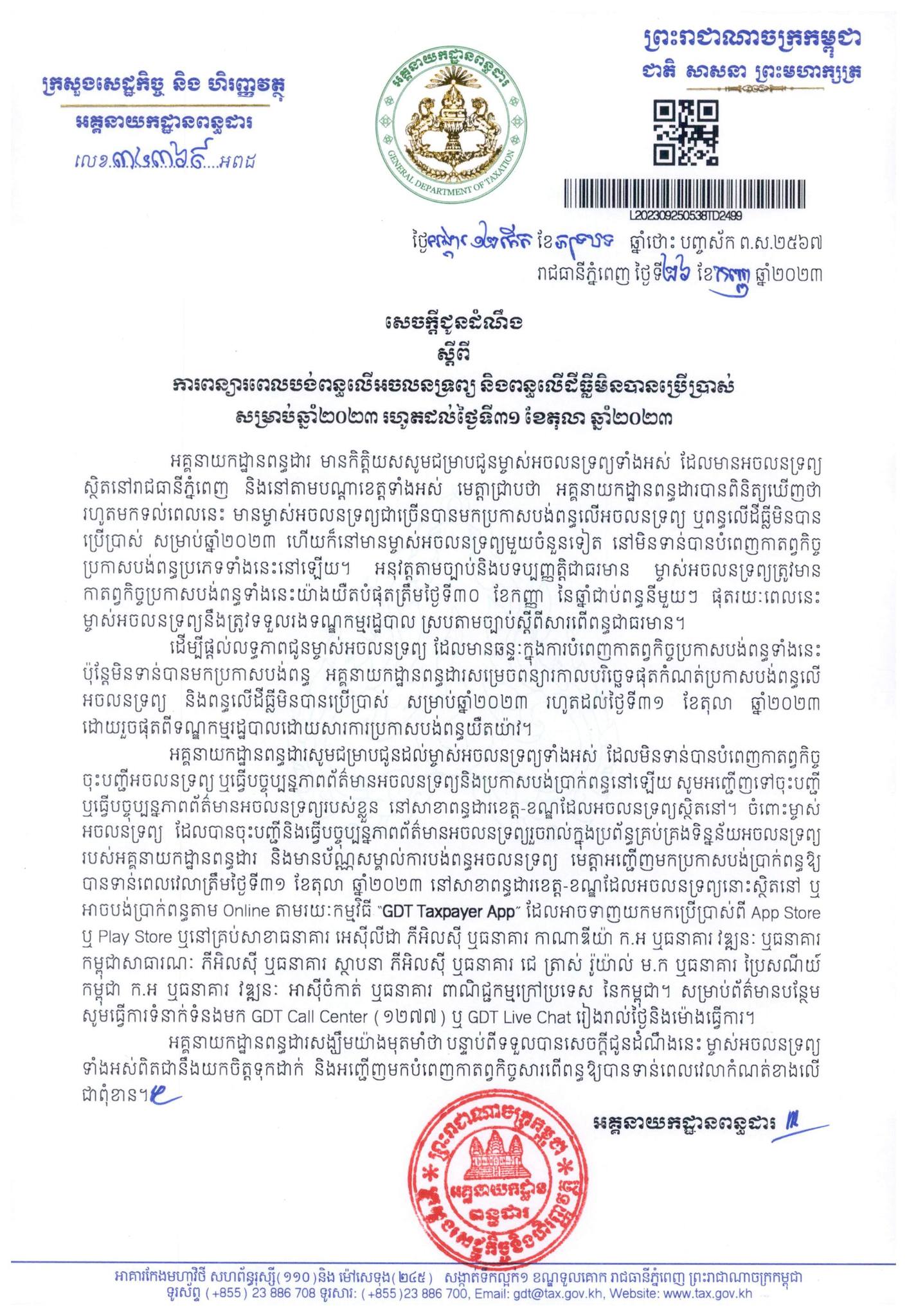 អគ្គនាយកដ្ឋានពន្ធដារ ជូនដំណឹង នៃការពន្យារពេលបង់ពន្ធលើអចលនទ្រព្យ និងពន្ធលើដីធ្លីមិនបានប្រើប្រាស់សម្រាប់ឆ្នាំ២០២៣ រហូតដល់ថ្ងៃទី ៣១ ខែតុលាខាងមុខ