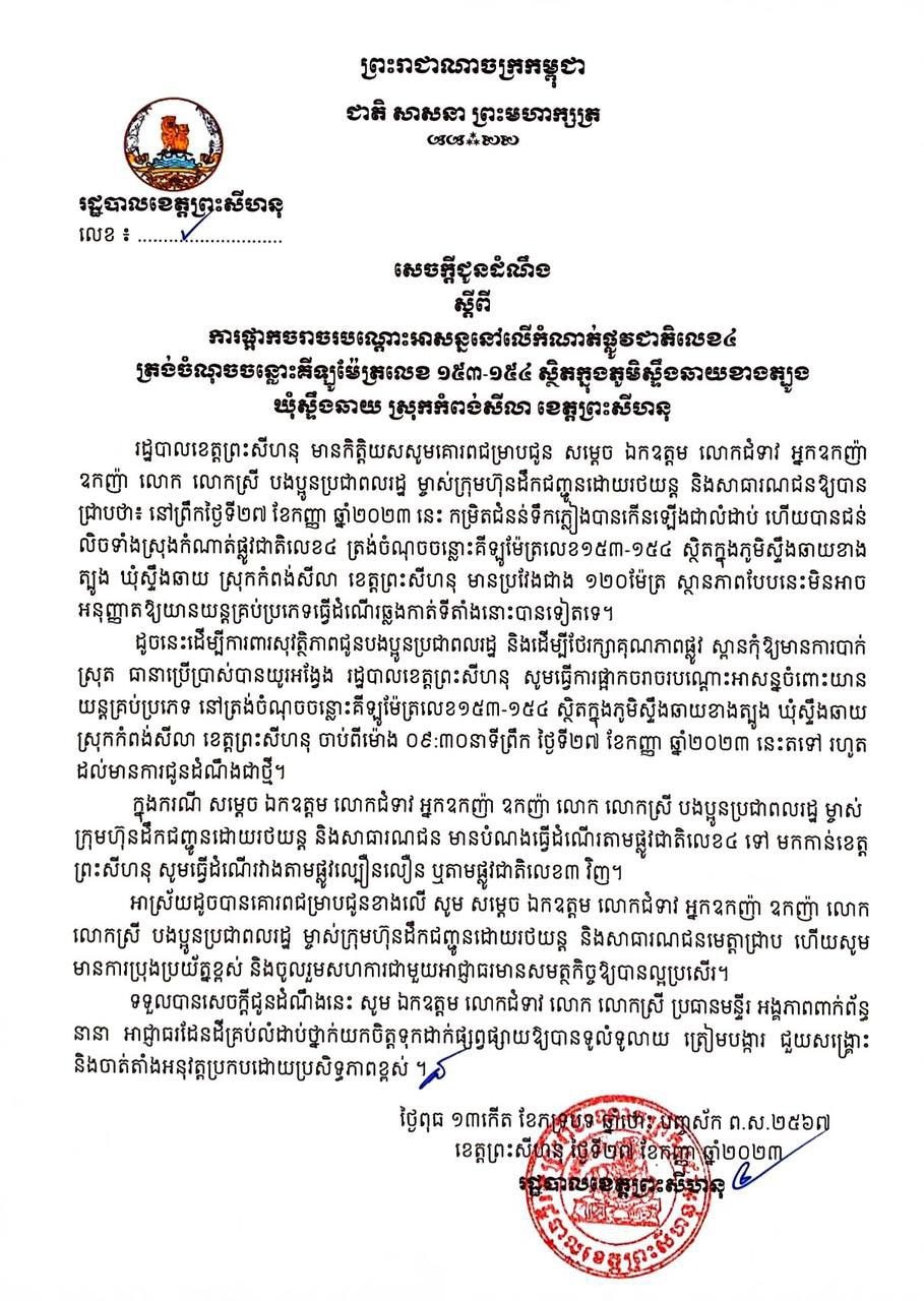 ដូច្នេះដើម្បីធានាដល់សុវត្ថិភាពក្នុងការធ្វើដំណើរ រដ្ឋបាលខេត្ត សូមធ្វើការផ្អាកចរាចរណ៍នៅត្រង់ទីតាំងខាងលើជាបណ្តោះអាសន្នសិន។ សូមសាធារណជន និងបងប្អូនប្រជាពលរដ្ឋ រកផ្លូវវៀងជាបណ្តោះអាសន្នសិន ឬអាចប្រើប្រាស់ផ្លូវល្បឿនលឿន៕ផ្តល់សិទ្ធិដោយ៖ freshnews