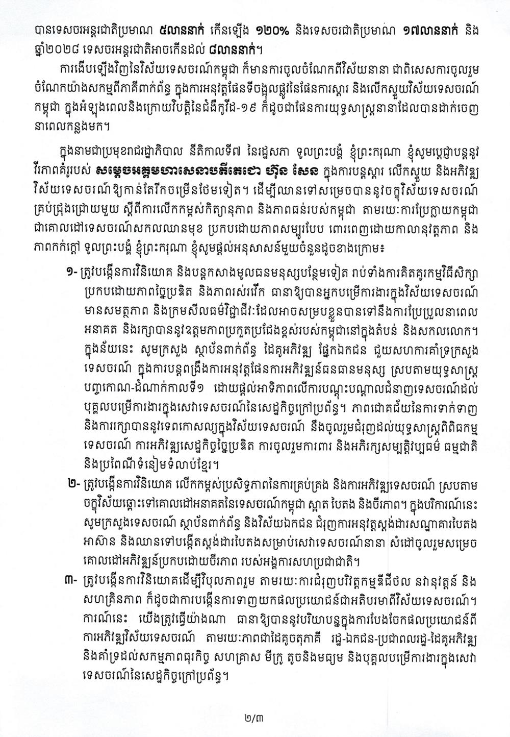 *ទី៥៖ ស្នើឱ្យក្រសួង ស្ថាប័នពាក់ព័ន្ធ និងដៃគូអភិវឌ្ឍន៍ក្នុងវិស័យទេសចរណ៍ទាំងអស់ផ្ដល់កិច្ចសហការ និងជួយគាំទ្រក្រសួងទេសចរណ៍លើគ្រប់រូបភាព ដើម្បីឆ្លើយតបទៅនឹងតម្រូវការនៃការវិវត្តរបស់វិស័យទេសចរណ៍កម្ពុជា និងជំរុញវិស័យនេះឱ្យកាន់មានភាពរស់រវើ ភាពប្រកួតប្រជែង ចីរភាព និងបរិយាបន្ន ក្នុងគោលដៅបង្កើនប្រសិទ្ធភាពនៃការគ្រប់គ្រងកិត្តិនាមកម្ពុជា ផ្សព្វផ្សាយភាពទាក់ទាញទេសចរណ៍កម្ពុជាទៅកាន់ទីផ្សារទេសចរណ៍សំខាន់ៗ អភិវឌ្ឍផលិតផលទេសចរណ៍ប្រកបដោយនវានុវត្តន៍ ភាពច្នៃប្រឌិត ព្រមទាំងអភិវឌ្ឍធនធាននិងគោលដៅទាក់ទាញទេសចរណ៍ប្រកបដោយភាពប្រកួតប្រជែងខ្ពស់៕ ផ្តល់សិទ្ធិដោយ៖ freshnews