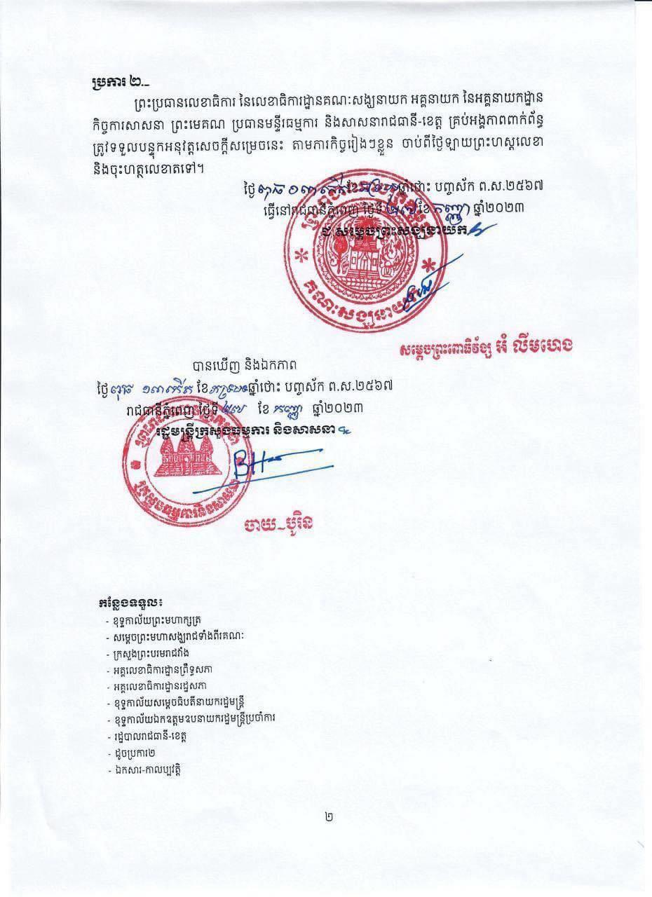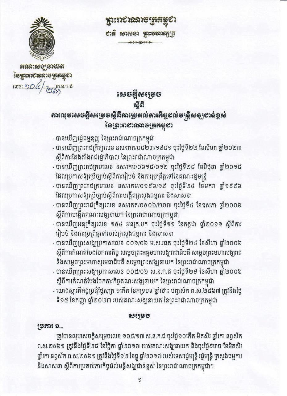 គណៈសង្ឃនាយក លុបសេចក្ដីសម្រេច ស្តីពីការប្រគល់ភារកិច្ចដល់មន្តីសង្ឃជាន់ខ្ពស់ នៃព្រះរាជាណាចក្រកម្ពុជា