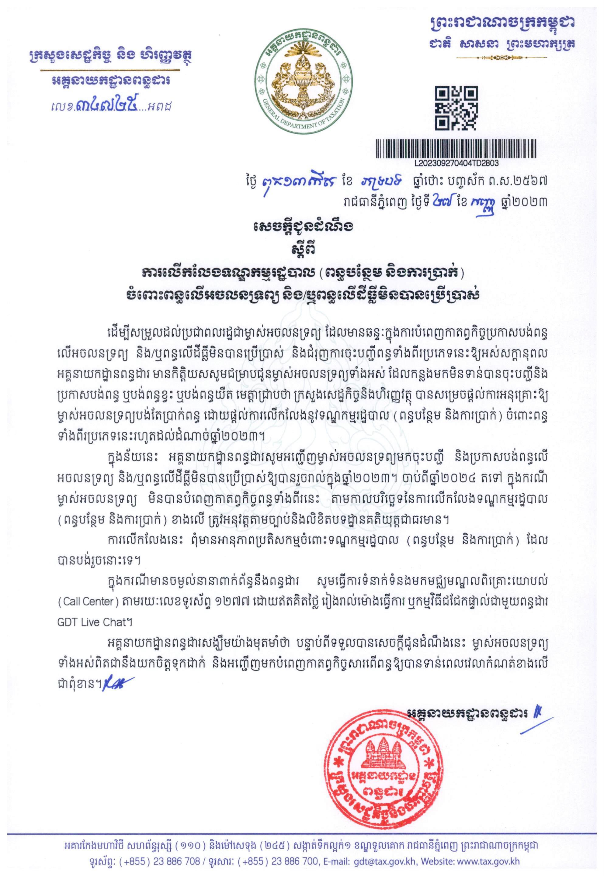 អគ្គនាយកដ្ឋានពន្ធដារ បានឱ្យដឹងក្នុងសេចក្តីជូនដំណឹងរបស់ខ្លួនថា «សូមជម្រាបជូនម្ចាស់អចលនទ្រព្យទាំងអស់ ដែលកន្លងមកមិនទាន់បានចុះបញ្ជី និងប្រកាសបង់ពន្ធ ឬបង់ពន្ធខ្វះ ឬបង់ពន្ធយឺត មេត្តាជ្រាបថា ក្រសួងសេដ្ឋកិច្ច និងហិរញ្ញវត្ថុ បានសម្រេចផ្តល់ការអនុគ្រោះឱ្យម្ចាស់អចលនទ្រព្យបង់តែប្រាក់ពន្ធ ដោយផ្តល់ការលើកលែងនូវទណ្ឌកម្មរដ្ឋបាល (ពន្ធបន្ថែម និងការប្រាក់) ចំពោះពន្ធទាំងពីរប្រភេទនេះ រហូតដល់ដំណាច់ឆ្នាំ២០២៣»។