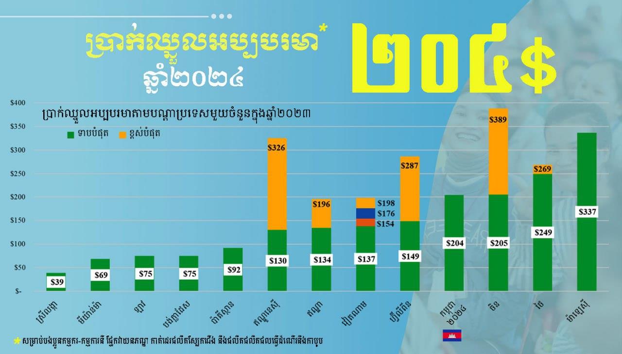 របាយការណ៍ពីអង្គការផ្នែកការងារ បានបង្ហាញថា ឆ្នាំ២០២៣ប្រទេសវៀតណាម មានប្រាក់ឈ្នួលចន្លោះពី ១៣៨​​ដុល្លារ ទៅ១៩៨ដុល្លារ, ប្រទេសស្រីលង្ការ ៣៩ដុល្លារ, ប្រទេសបង់ក្លាដែស ៧៤ដុល្លារ, ប្រទេសឡាវ ៧៥ដុល្លារ និងប្រទេសមីយ៉ាន់ម៉ា ៦៩ដុល្លារ។