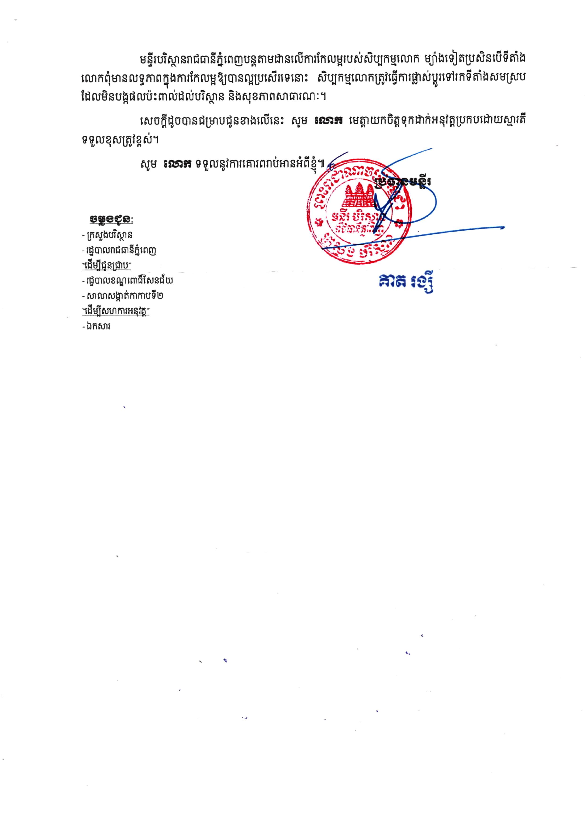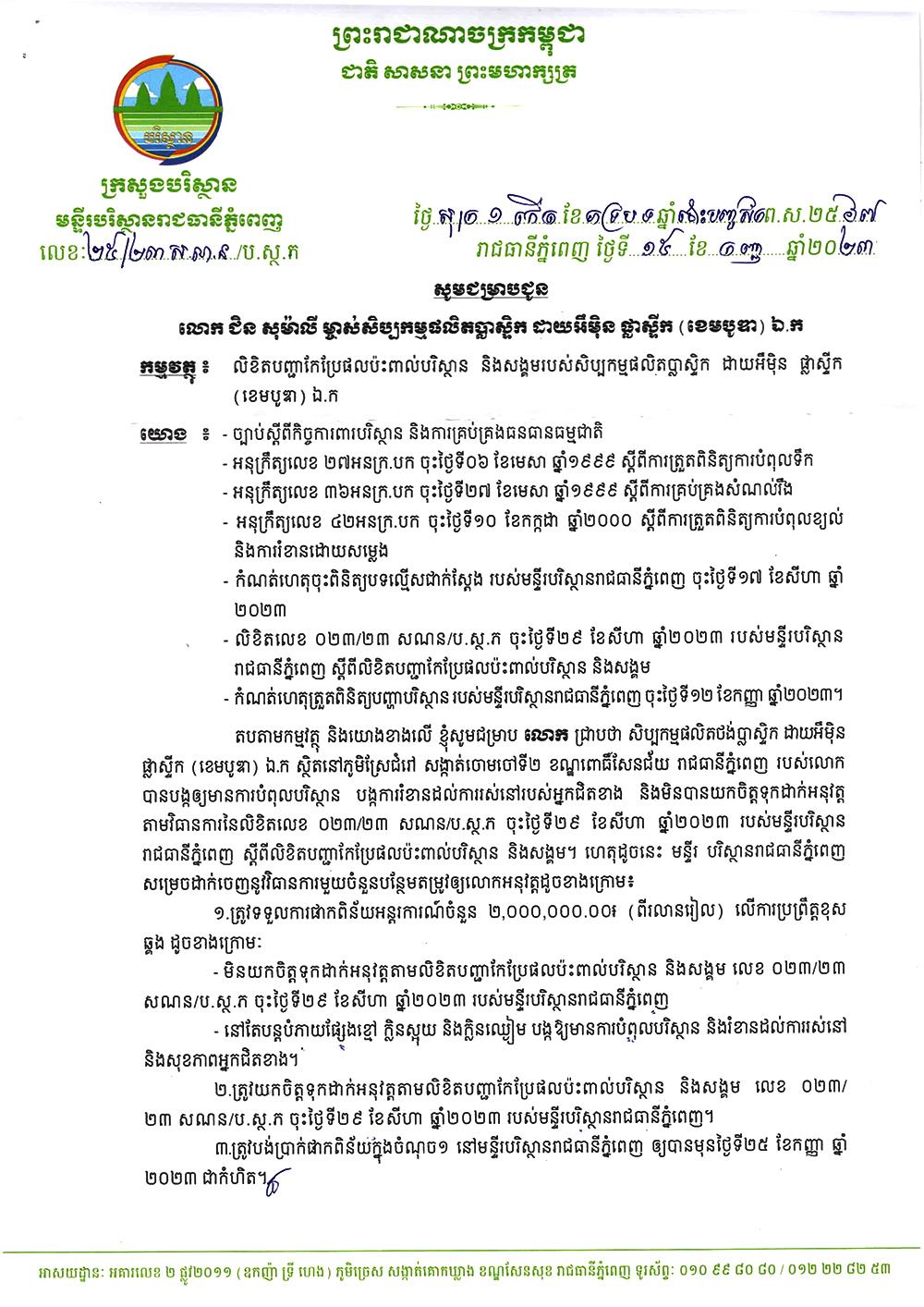 ក្រោយការចុះមើលជាក់ស្តែង មន្ទីរបរិស្ថានបានចេញលិខិតបញ្ជាកែប្រែផលប៉ះពាល់បរិស្ថាន ដោយអនុវត្តវិធានការផាកពិន័យចំពោះសិប្បកម្មចំនួន ២លានរៀលផងដែរ។
