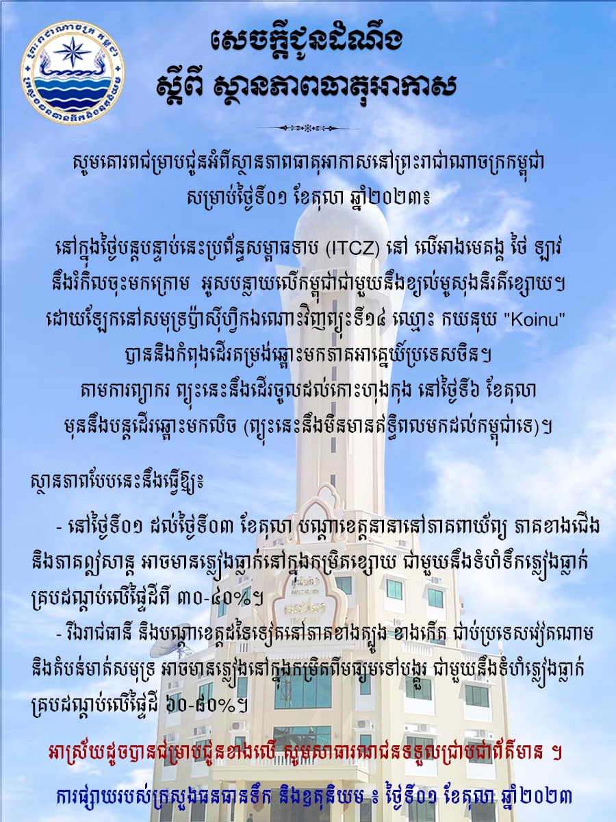 ក្រសួងធនធានទឹក ជូនដំណឹងពីស្ថានភាពធាតុអាកាសនៅកម្ពុជា សម្រាប់ថ្ងៃទី០១ ខែតុលា ឆ្នាំ២០២៣ ដែលអាចមានភ្លៀងធ្លាក់ពីខ្សោយទៅបង្គួរ