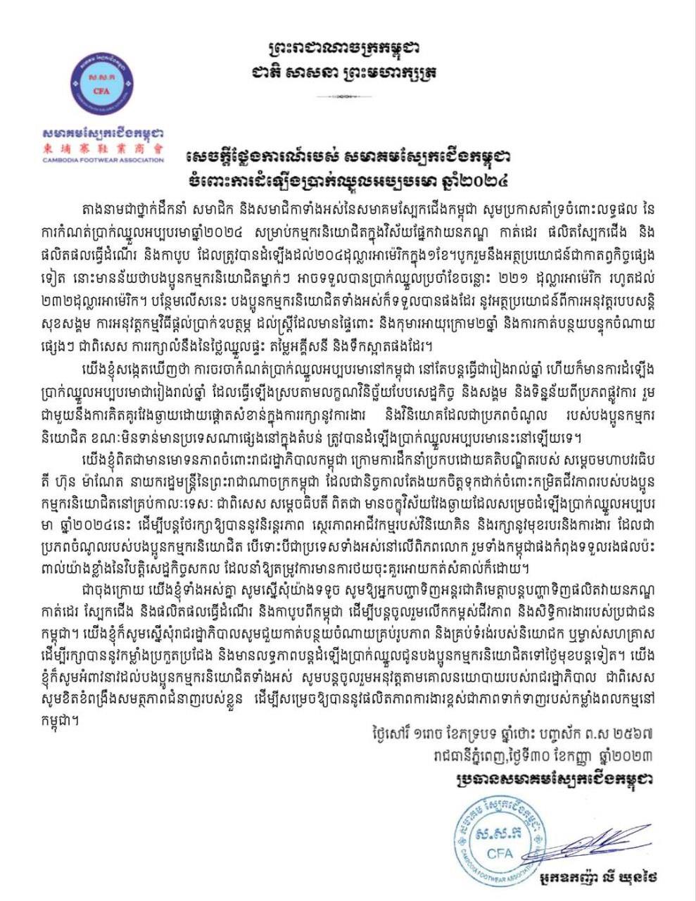 ក្នុងសេចក្តីថ្លែងការណ៍នោះ សមាគមបានសង្កត់ធ្ងន់ថា ៖ “យើងខ្ញុំសូមគាំទ្រយ៉ាងពេញទំហឹងចំពោះការដំឡើងប្រាក់ឈ្នួលអប្បបរមារហូតដល់ ២០៤ដុល្លារអាម៉េរិកក្នុង១ខែ សម្រាប់ឆ្នាំ២០២៤ខាងមុខ និងសូមប្តេជ្ញាចូលរួមអនុវត្តរាល់វិធានការអន្តរាគមន៍ផ្សេងៗ ដែលរាជរដ្ឋាភិបាលបាននិងកំពុងដាក់ចេញ ដើម្បីចូលរួមលើកកម្ពស់ជីវភាព និងបន្តរក្សា និងបង្កើតឱកាសការងារជូនបងប្អូនកម្មករនិយោជិត ព្រមទាំងបន្ដជំរុញឱ្យមានបរិយាកាសវិនិយោគ និងធុរកិច្ចកាន់តែប្រសើរឡើងប្រកបដោយភាពទាក់ទាញ”។