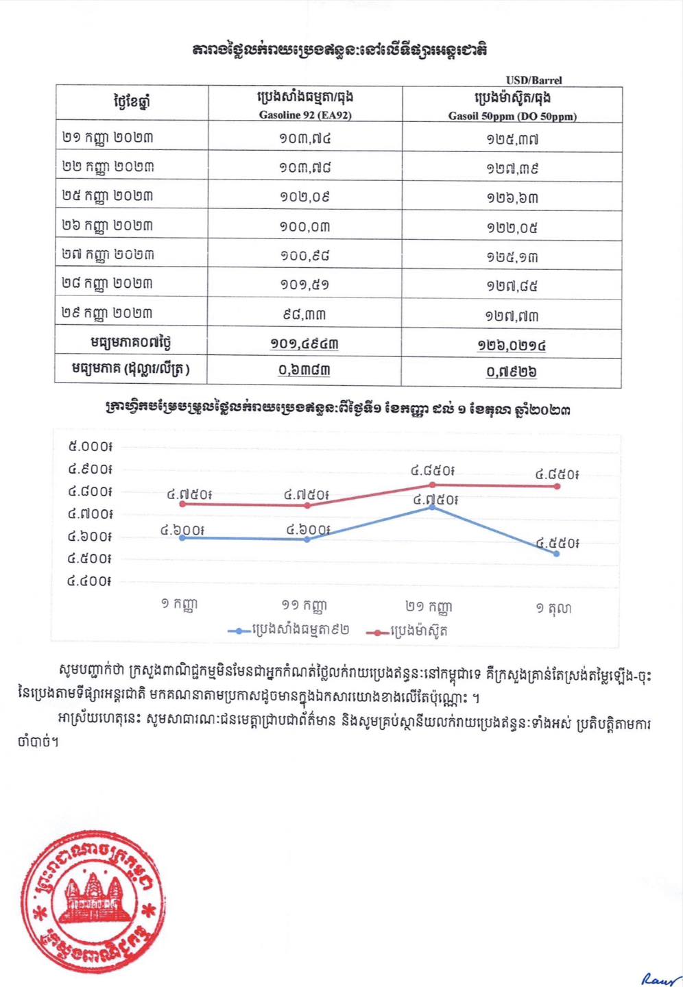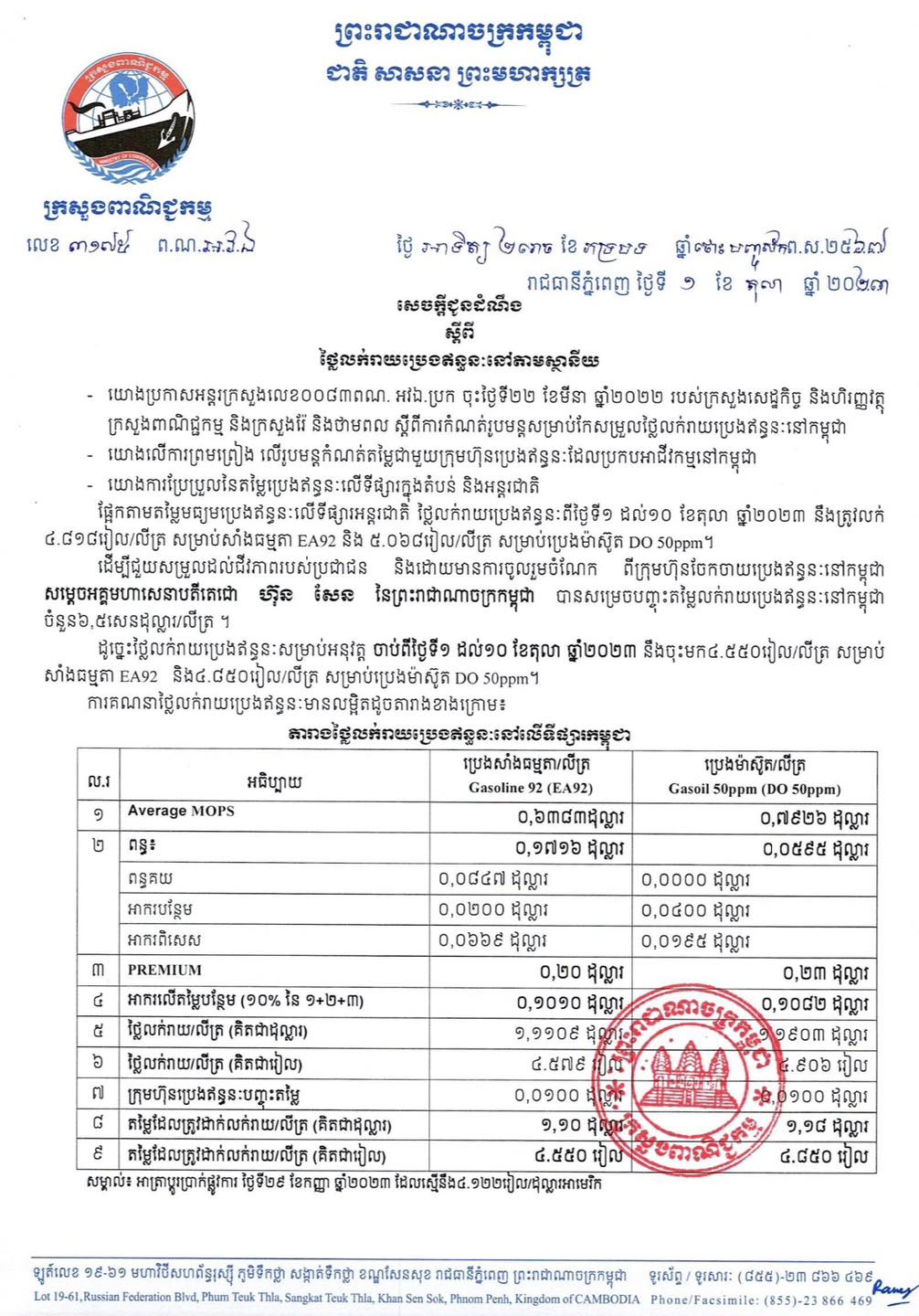 ក្រសួងពាណិជ្ជកម្ម៖ តម្លៃសាំងធម្មតាត្រូវលក់តម្លៃ ៤,៧៥០រៀល និងម៉ាស៊ូតលក់តម្លៃ ៤,៨៥០រៀល ចាប់ពីថ្ងៃនេះ ដល់ថ្ងៃទី១០ ខែតុលា ឆ្នាំ២០២៣