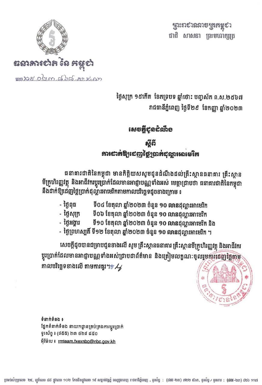 នឹងដាក់ឱ្យដេញថ្លៃប្រាក់ដុល្លារអាមេរិកចំនួន៤០លានដុល្លារបន្ថែមទៀត ដូច្នេះសូមគ្រឹះស្ថានធនាគារ គ្រឹះស្ថានមីក្រូហិរញ្ញវត្ថុ និងអាជីវករប្ដូរប្រាក់ដែលមានអាជ្ញាបណ្ណទាំងអស់ត្រៀមលក្ខខណៈចូលរួមដេញថ្លៃ។