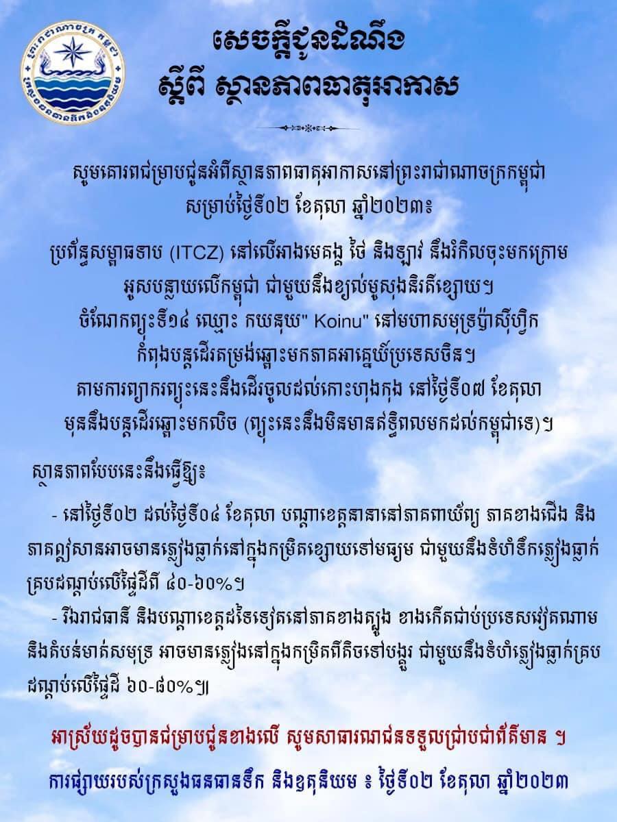 ក្រសួងធនធានទឹក ជូនដំណឹងពីស្ថានភាពធាតុអាកាសនៅកម្ពុជា សម្រាប់ថ្ងៃទី០២ ខែតុលា ឆ្នាំ២០២៣