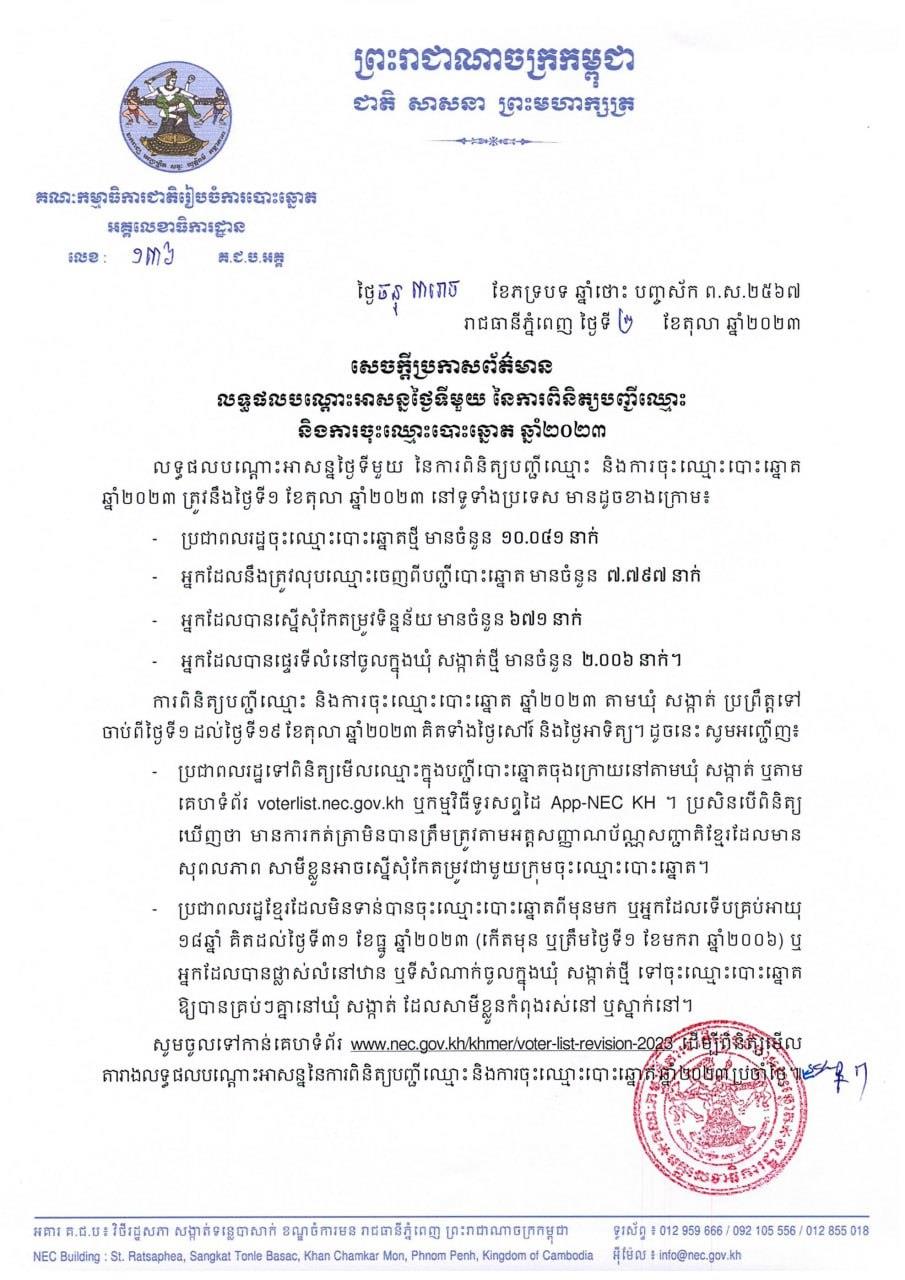 ការពិនិត្យបញ្ជីឈ្មោះ និងការចុះឈ្មោះបោះឆ្នោត ឆ្នាំ២០២៣ តាមឃុំ សង្កាត់ ប្រព្រឹត្តទៅចាប់ពីថ្ងៃទី១ ដល់ថ្ងៃទី១៩ ខែតុលា ឆ្នាំ២០២៣ គិតទាំងថ្ងៃសៅរ៍ និងថ្ងៃអាទិត្យ។ ដូចនេះ សូមអញ្ជើញ៖