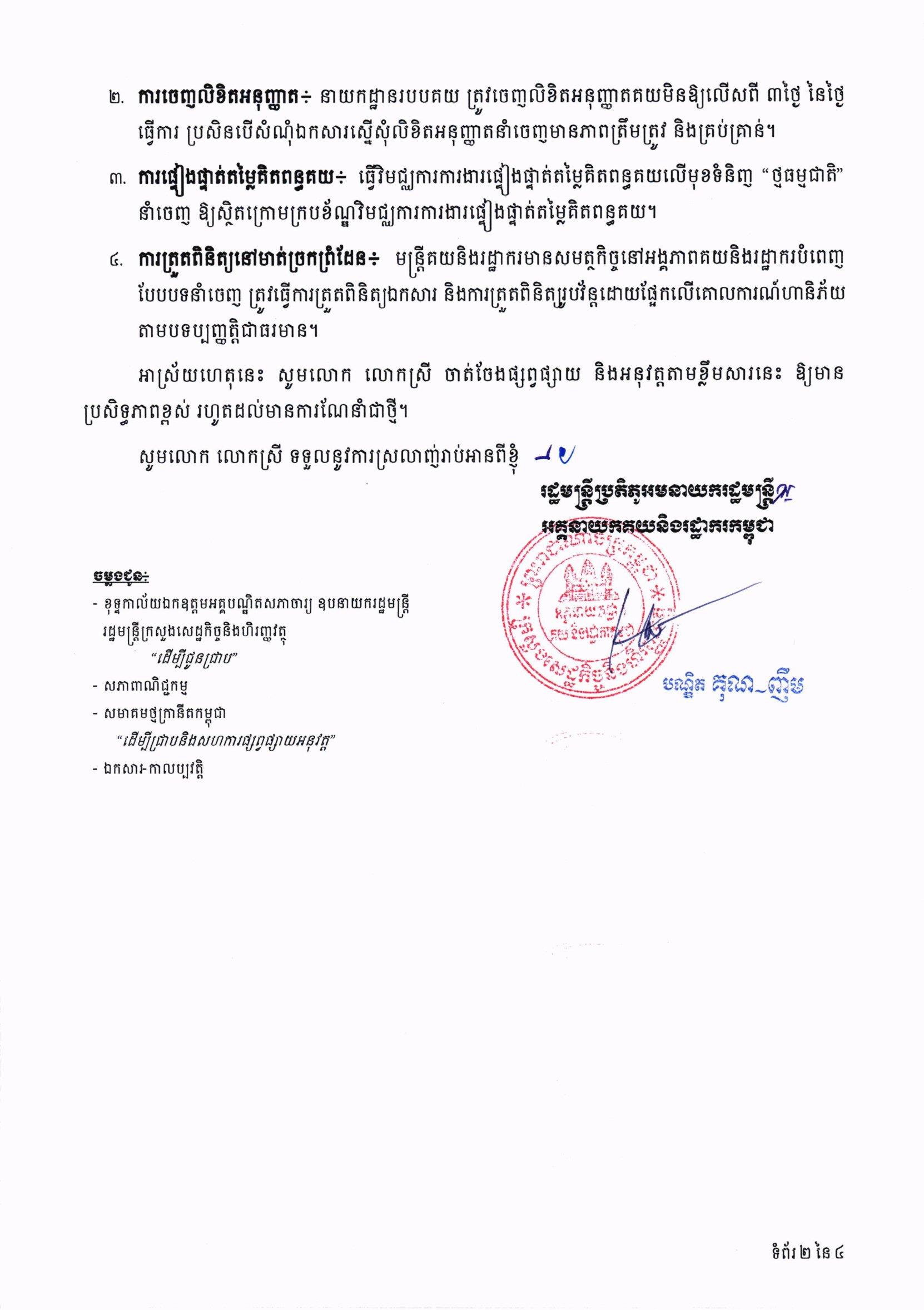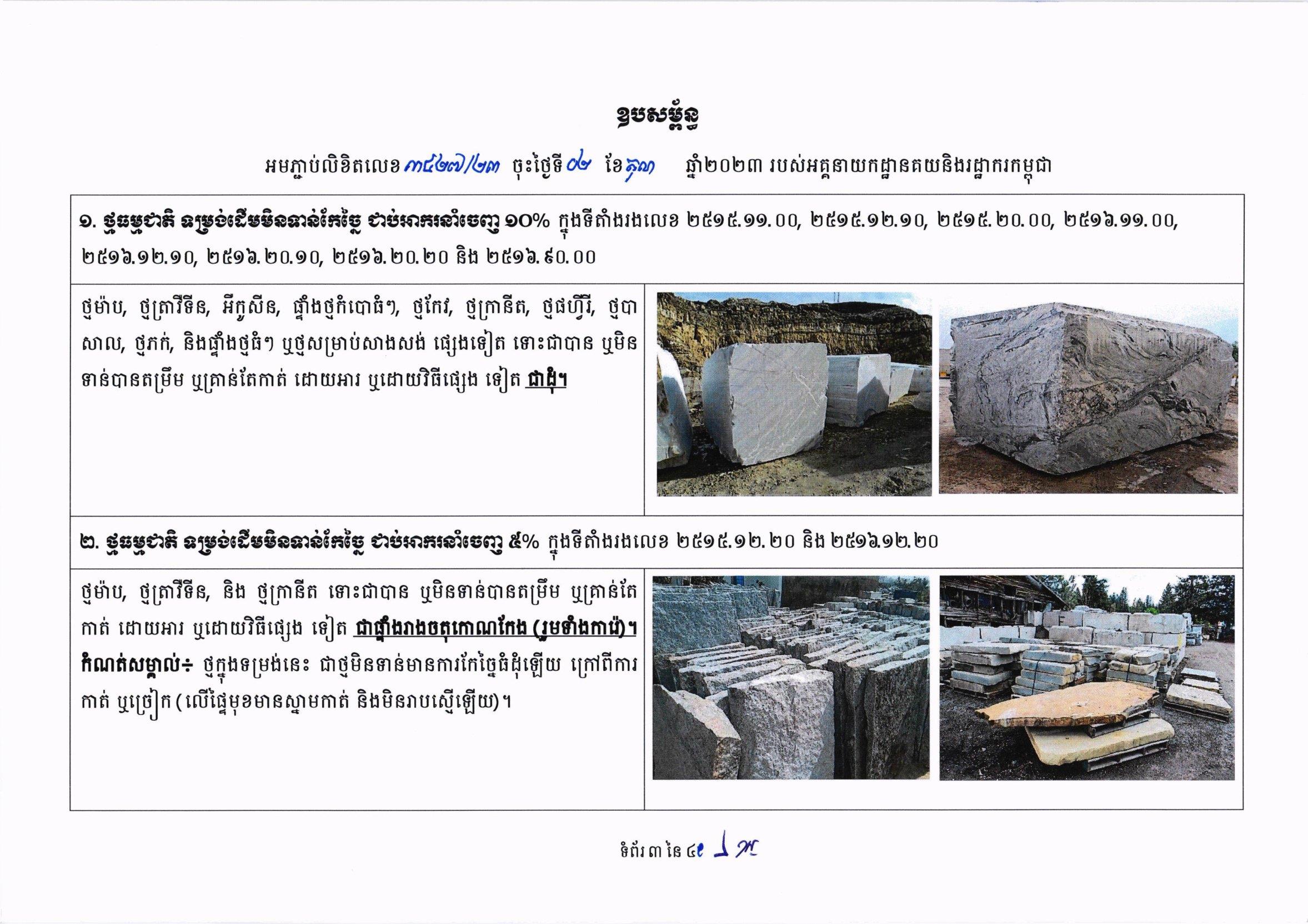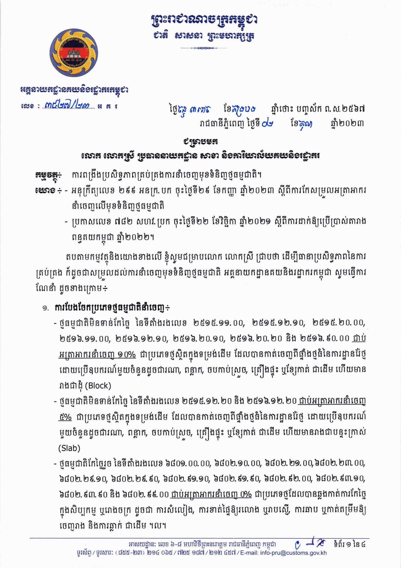 (ភ្នំពេញ)៖ បណ្ឌិត គុណ ញឹម រដ្ឋមន្រ្តីប្រតិភូអមនាយករដ្ឋមន្ត្រី អគ្គនាយក នៃអគ្គនាយកដ្ឋានគយ និងរដ្ឋាករកម្ពុជា បានចេញលិខិតជម្រាបមក លោក-លោកស្រី ប្រធាននាយកដ្ឋាន សាខា និងការិយាល័យ គយ និងរដ្ឋាករ ណែនាំអំពីការពង្រឹងប្រសិទ្ធភាព គ្រប់គ្រងការនាំចេញមុខទំនិញថ្មធម្មជាតិ។ នេះបើតាមលិខិតដែលបណ្ដាញព័ត៌មាន Fresh News ទទួលបាននៅថ្ងៃទី០៣ ខែតុលា ឆ្នាំ២០២៣។