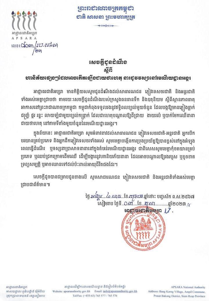 ខាងក្រោមនេះជាសេចក្ដីជូនដំណឹងរបស់អាជ្ញាធរជាតិអប្សរា៖