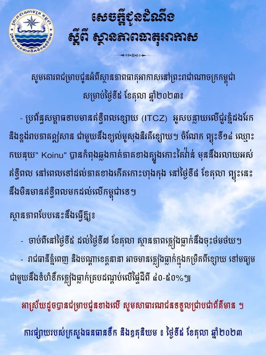 ក្រសួងធនធានទឹក ជូនដំណឹងពីស្ថានភាពធាតុអាកាសនៅកម្ពុជា សម្រាប់ថ្ងៃទី៥ ខែតុលា ឆ្នាំ២០២៣ អាចនឹងមានភ្លៀងធ្លាក់ពីខ្សោយទៅមធ្យម