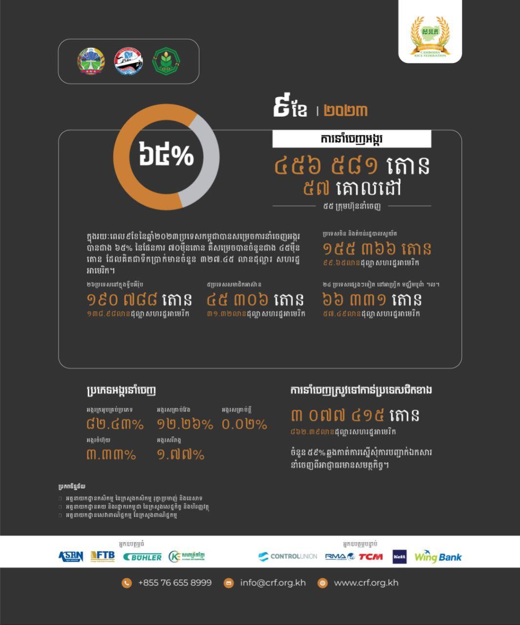 តាមរបាយការណ៍របស់សហព័ន្ធស្រូវអង្ករកម្ពុជា ដែលអង្គភាពព័ត៌មាន Fresh News ទទួលបាននៅរសៀលថ្ងៃទី៦ ខែតុលា ឆ្នាំ២០២៣នេះ បានបញ្ជាក់ថា «ក្នុងរយៈពេល៩ខែ ឆ្នាំ២០២៣ កម្ពុជាបាននាំចេញអង្ករចំនួន ៤៥៦ ៥៨១ តោននាំចេញដោយក្រុមហ៊ុននាំចេញអង្ករចំនួន ៥៥ក្រុមហ៊ុន ទៅកាន់គោលដៅចំនួន ៥៧ ដែលគិតជាទឹកប្រាក់បានចំនួន ៣២៧.៤៥ លានដុល្លារ»