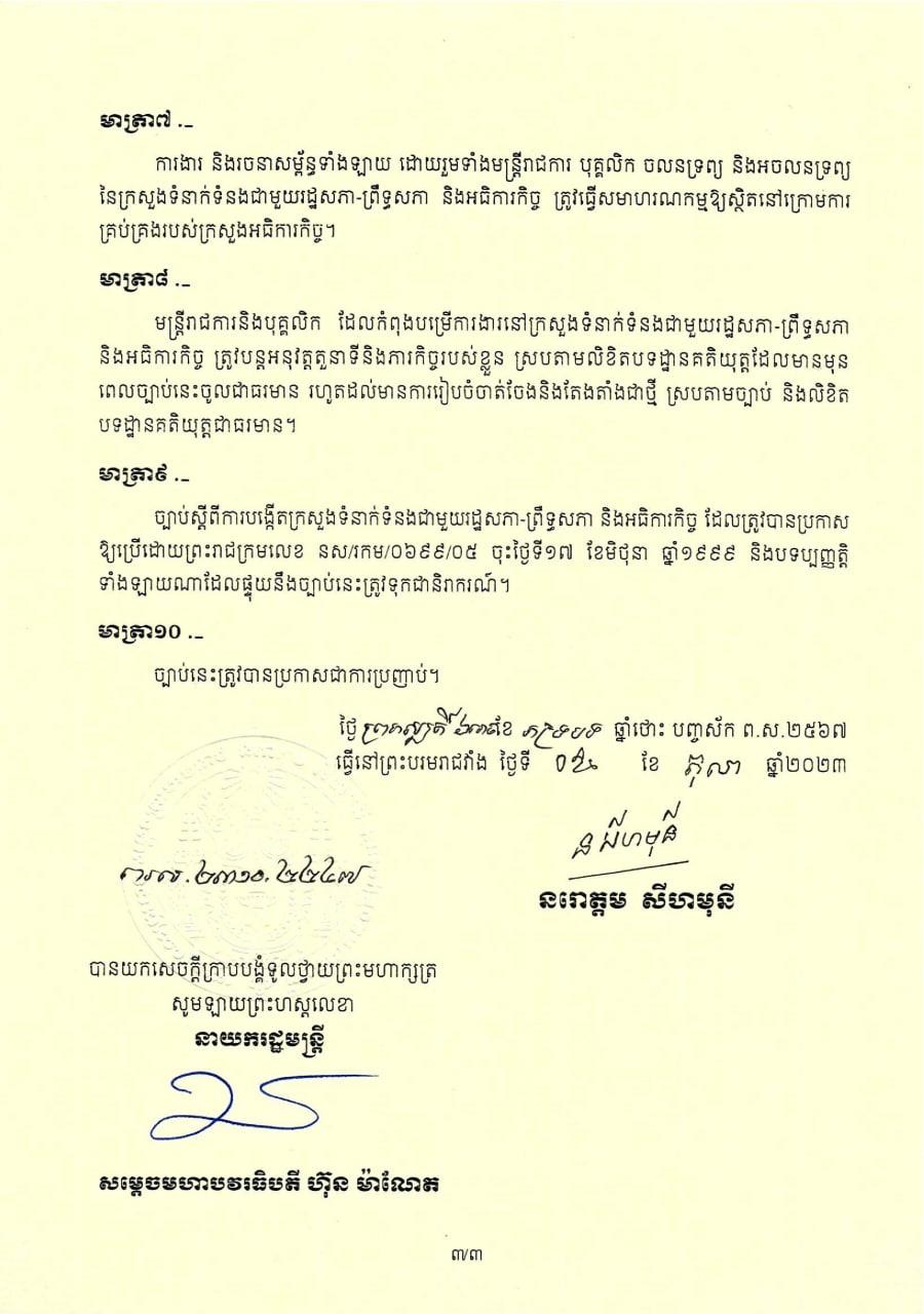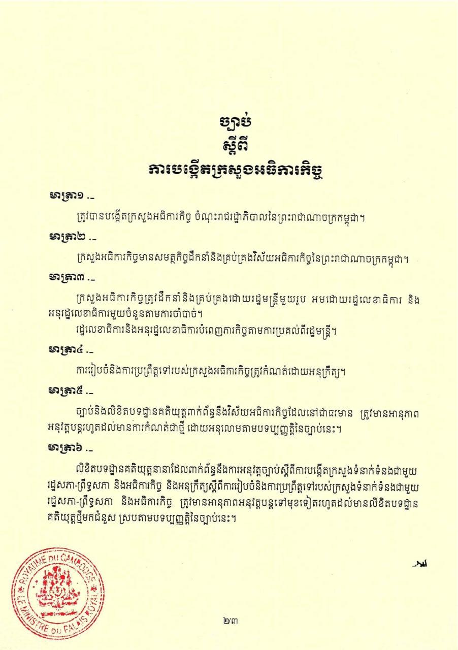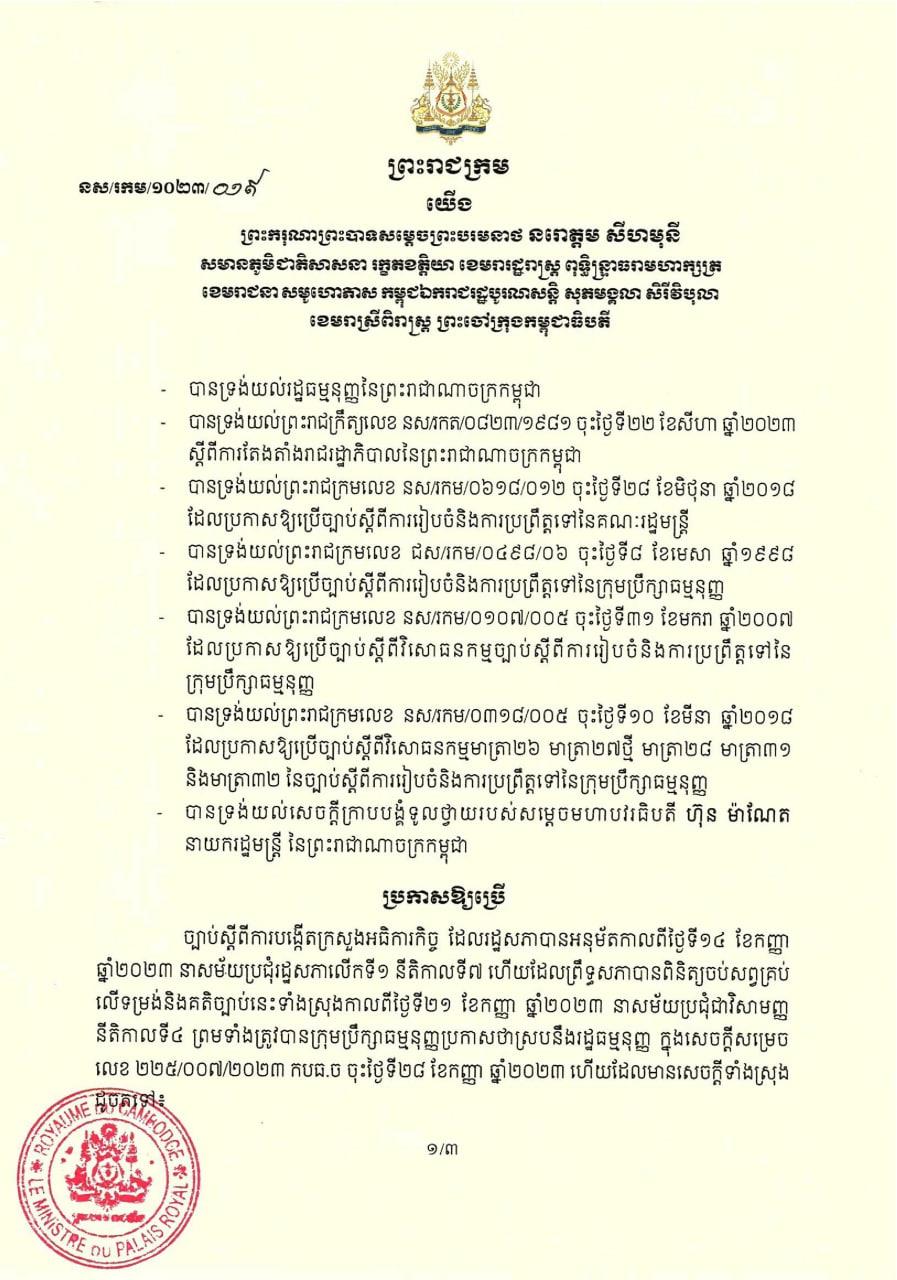 ព្រះមហាក្សត្រ ចេញព្រះរាជក្រមប្រកាសឱ្យប្រើច្បាប់ស្ដីពីការបង្កើតក្រសួងអធិការកិច្ច