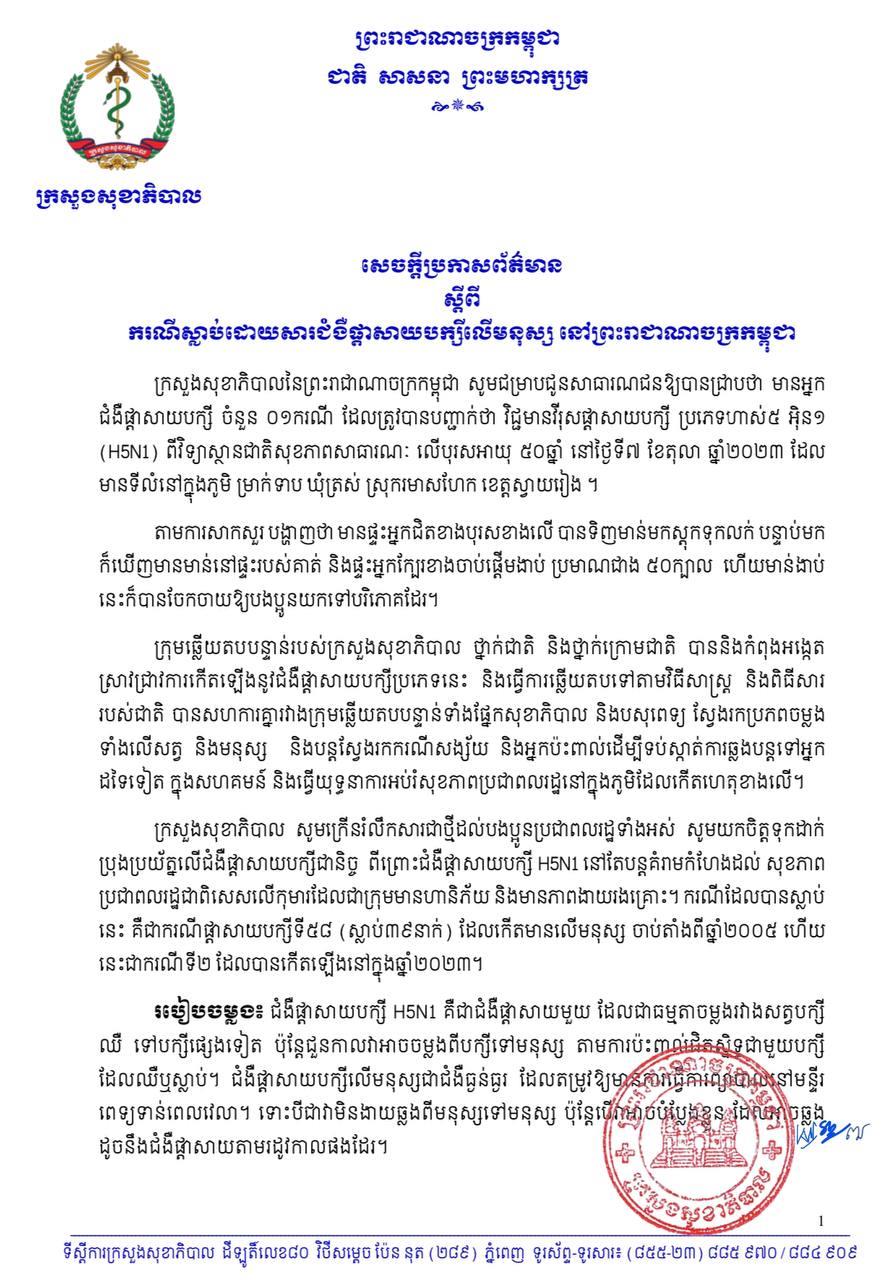 ក្រសួងសុខាភិបាល ប្រកាសព័ត៌មានស្តីពីករណីបាត់បង់ជីវិត ដោយសារជំងឺផ្តាសាយបក្សីលើមនុស្ស នៅប្រទេសកម្ពុជា