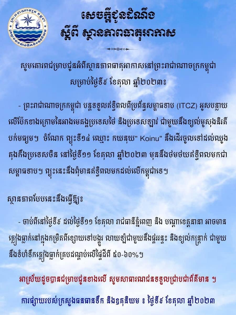 ក្រសួងធនធានទឹក ជូនដំណឹងពីស្ថានភាពធាតុអាកាសនៅកម្ពុជា សម្រាប់ថ្ងៃទី៩ ខែតុលា ឆ្នាំ២០២៣, អាចមានភ្លៀងធ្លាក់ពីខ្សោយទៅបង្គួរ