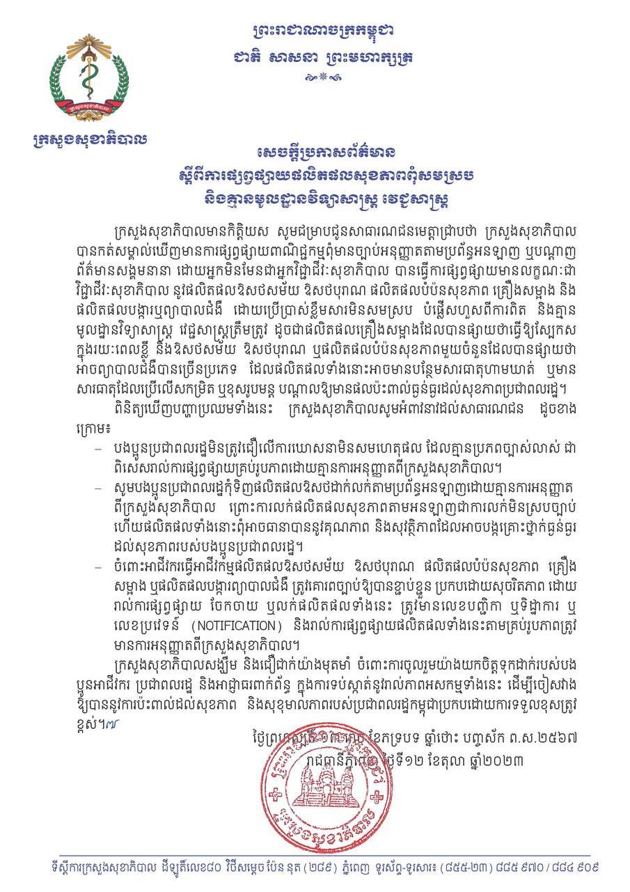 ក្រសួងសុខាភិបាល អំពាវនាវដល់ប្រជាពលរដ្ឋកុំជឿ និងកុំទិញផលិតផលសុខភាព ដែលផ្សព្វផ្សាយពុំសមស្រប និងគ្មានមូលដ្ឋានវិទ្យាសាស្ត្រវជ្ជសាស្ត្រ គ្មានការអនុញ្ញាតពីក្រសួង