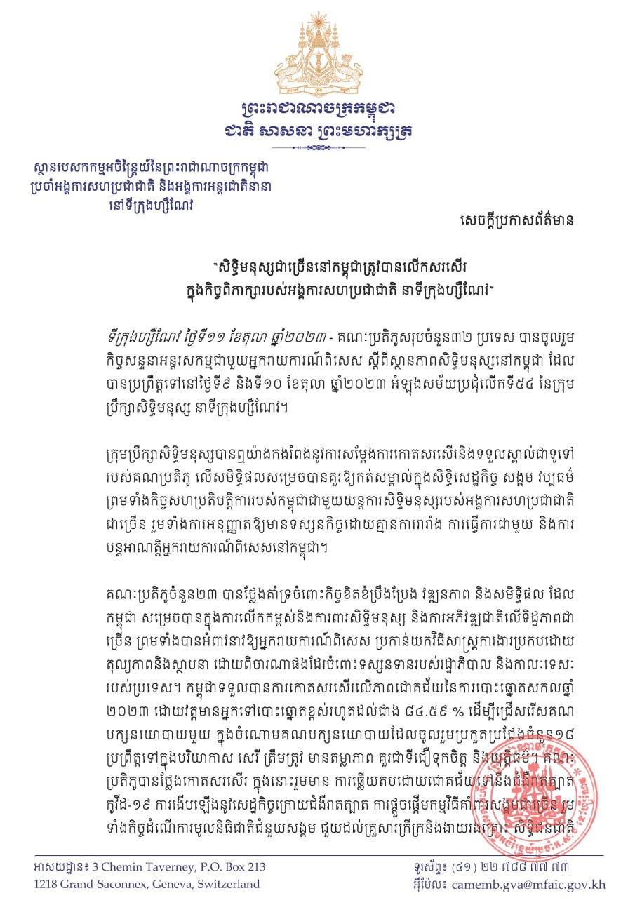 គណៈប្រតិភូចំនួន២៣ បានថ្លែងគាំទ្រចំពោះកិច្ចខិតខំប្រឹងប្រែង វឌ្ឍនភាព និងសមិទ្ធិផល ដែល កម្ពុជាសម្រេចបានក្នុងការលើកកម្ពស់ និងការពារសិទ្ធិមនុស្ស និងការអភិវឌ្ឍជាតិលើទិដ្ឋភាពជាច្រើន ព្រមទាំងបានអំពាវនាវឱ្យអ្នករាយការណ៍ពិសេស ប្រកាន់យកវិធីសាស្ត្រការងារប្រកបដោយ តុល្យភាពនិងស្ថាបនា ដោយពិចារណាផងដែរចំពោះទស្សនទានរបស់រដ្ឋាភិបាល និងកាលៈទេសៈ របស់ប្រទេស។ កម្ពុជាទទួលបានការកោតសរសើរលើភាពជោគជ័យនៃការបោះឆ្នោតសកលឆ្នាំ ២០២៣ ដោយវត្តមានអ្នកទៅបោះឆ្នោតខ្ពស់រហូតដល់ជាង ៨៤.៥៩ % ដើម្បីជ្រើសរើសគណ បក្សនយោបាយមួយ ក្នុងចំណោមគណបក្សនយោបាយដែលចូលរួមប្រកួតប្រជែងចំនួន១៨ ប្រព្រឹត្តទៅក្នុងបរិយាកាស សេរី ត្រឹមត្រូវ មានតម្លាភាព គួរជាទីជឿទុកចិត្ត និងយុត្តិធម៌។