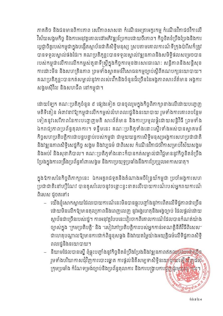 (ហ្សឺណែវ)៖ គណៈប្រតិភូសរុបចំនួន៣២ប្រទេស បានចូលរួម កិច្ចសន្ទនាអន្តរសកម្មជាមួយអ្នករាយការណ៍ពិសេស ស្ដីពីស្ថានភាពសិទ្ធិមនុស្សនៅកម្ពុជា ដែលបានប្រព្រឹត្តទៅនៅថ្ងៃទី៩ និងទី១០ ខែតុលា ឆ្នាំ២០២៣ អំឡុងសម័យប្រជុំលើកទី៥៤ នៃក្រុម ប្រឹក្សាសិទ្ធិមនុស្ស នាទីក្រុងហ្សឺណែវ។ នេះបើតាមសេចក្តីថ្លែងការណ៍របស់ ស្ថានបេសកកម្មអចិន្ត្រៃយ៍កម្ពុជា ប្រចាំអង្គការសហប្រជាជាតិ។