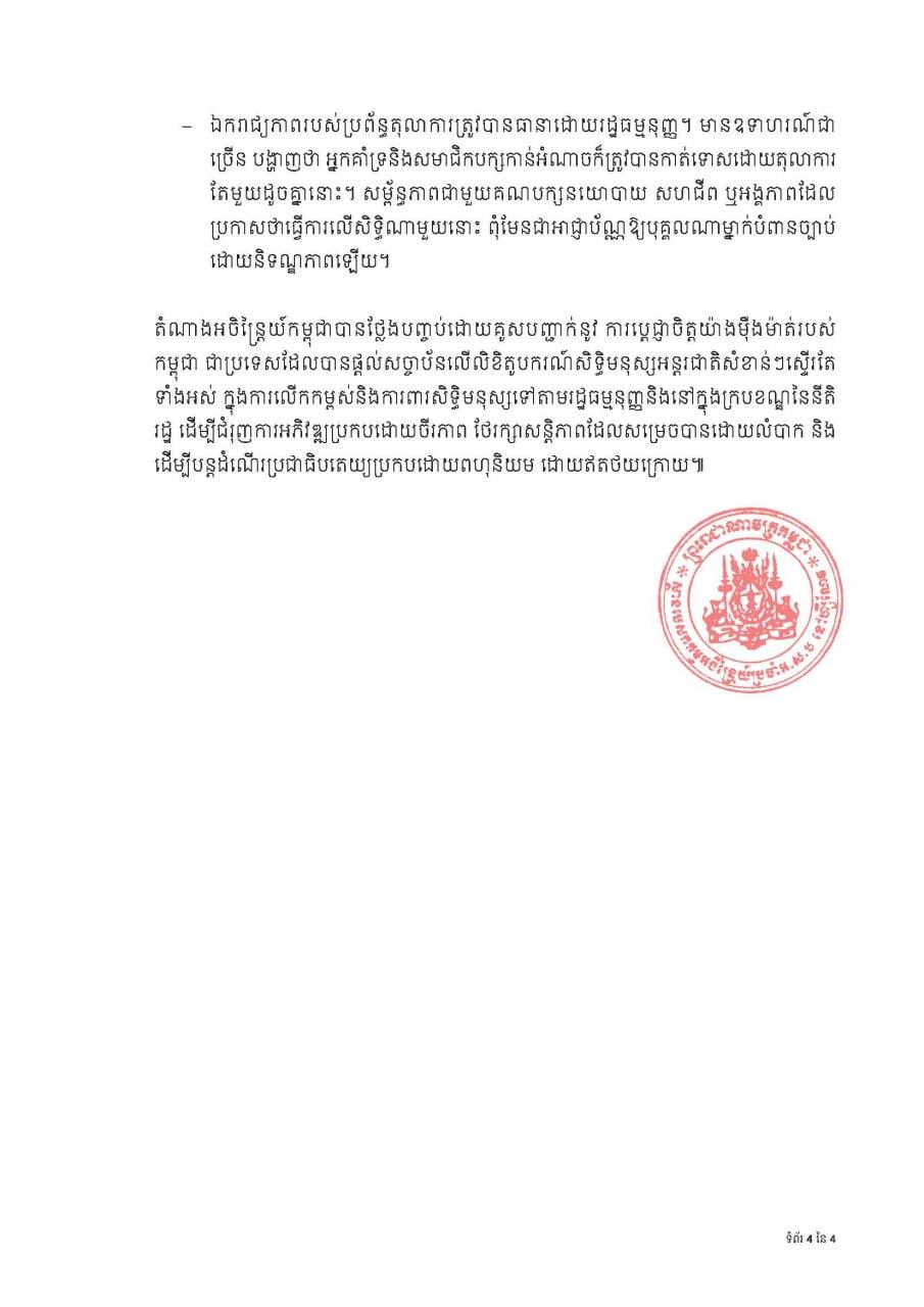 ដោយឡែក គណៈប្រតិភូចំនួន ៩ ផ្សេងទៀត បានចូលរួមក្នុងកិច្ចពិភាក្សាខាងលើដោយបញ្ចេញ មតិទិតៀន អំពាវនាវឱ្យកម្ពុជាលើកកម្ពស់លំហពលរដ្ឋនិងនយោបាយ រួមទាំងការគោរពបន្ថែម ទៀតនូវសេរីភាពនៃការបញ្ចេញមតិ សារព័ត៌មាន និងការប្រមូលផ្តុំដោយសន្តិវិធី ព្រមទាំង ឯករាជ្យភាពប្រព័ន្ធតុលាការ។ ទន្ទឹមនេះ គណៈប្រតិភូទាំងនោះស្ទើរទាំងអស់បានស្វាគមន៍ កិច្ចសហប្រតិបត្តិការជាបន្តបន្ទាប់របស់កម្ពុជា ជាមួយយន្តការសិទ្ធិមនុស្សអង្គការសហប្រជាជាតិ និងវឌ្ឍនភាពសិទ្ធិសេដ្ឋកិច្ច សង្គម និងវប្បធម៌ ជាពិសេស កំណើនវិភាជថវិកាសម្រាប់វិស័យសង្គម និងអប់រំ និងសុខាភិបាល។ គណៈប្រតិភូទាំងនោះក៏បានកត់សម្គាល់ជាវិជ្ជមាននូវកិច្ចខិតខំប្រឹង ប្រែងក្នុងការពង្រឹងប្រព័ន្ធគាំពារសង្គម និងការប្រយុទ្ធប្រឆាំងនឹងការប្រែប្រួលអាកាសធាតុ៕ ផ្តល់សិទ្ធិដោយ៖ freshnews