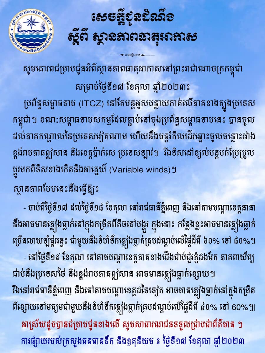 ក្រសួងធនធានទឹក ជូនដំណឹងពីស្ថានភាពធាតុអាកាសនៅកម្ពុជា សម្រាប់ថ្ងៃទី១៧ ខែតុលា ឆ្នាំ២០២៣, អាចមានភ្លៀងធ្លាក់ពីតិចទៅបង្គួរ