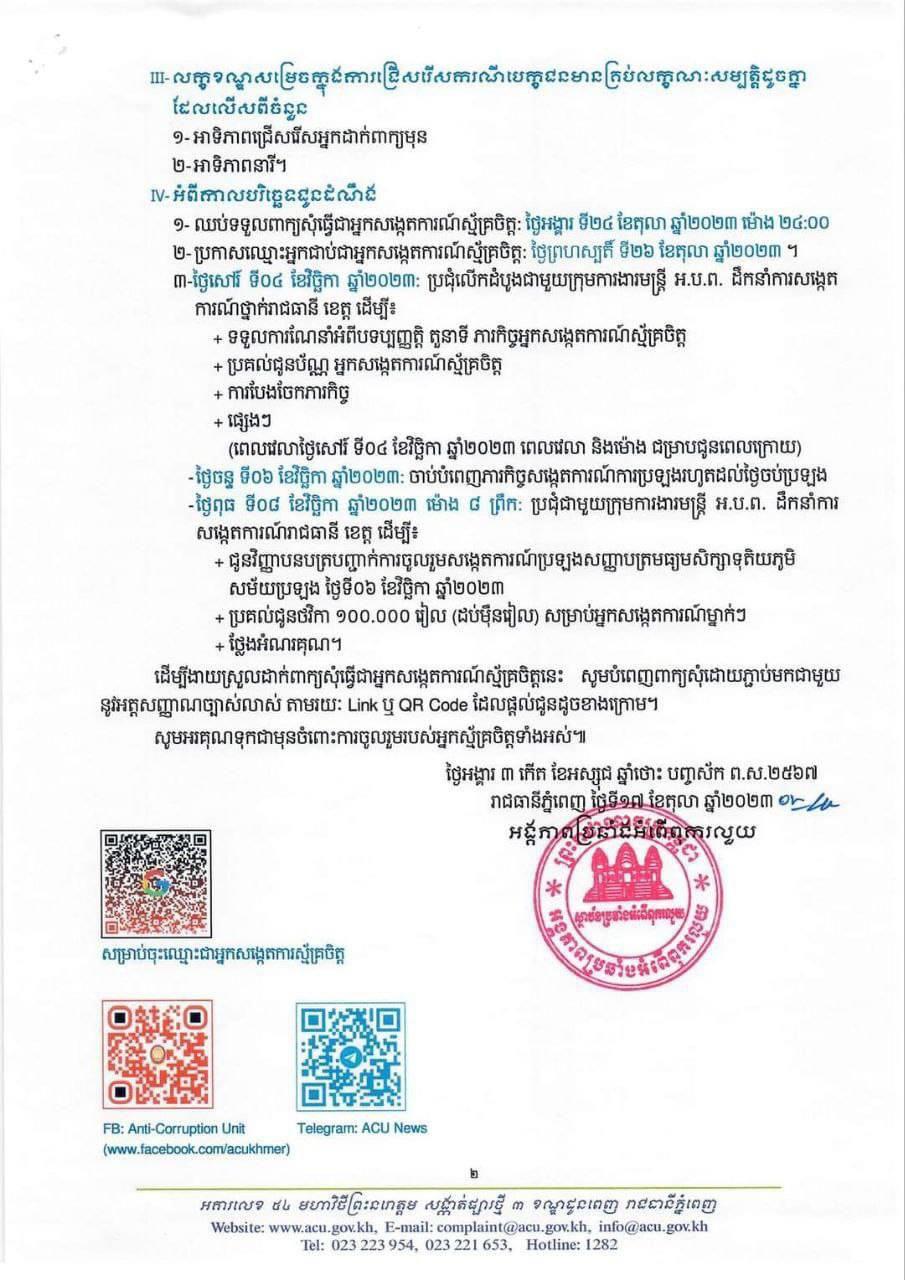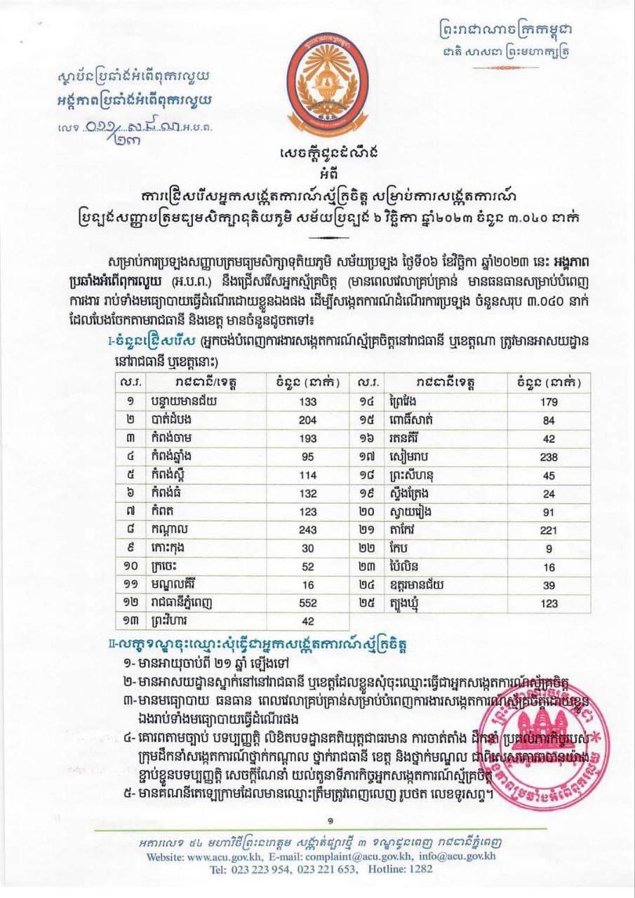 (ភ្នំពេញ)៖ អង្គភាពប្រឆាំងអំពើពុករលួយ (ACU) នាថ្ងៃទី១៨ ខែតុលា ឆ្នាំ២០២៣ បានចេញសេចក្តីជូនដំណឹងប្រកាសជ្រើសរើសអ្នកសង្កេតការណ៍ស្ម័គ្រចិត្តចំនួន ៣,០៤០នាក់ សម្រាប់ការសង្កេតការណ៍ ប្រឡងសញ្ញាបត្រមធ្យមសិក្សាទុតិយភូមិ សម័យប្រឡង៖ ០៦ វិច្ឆិកា ២០២៣៕