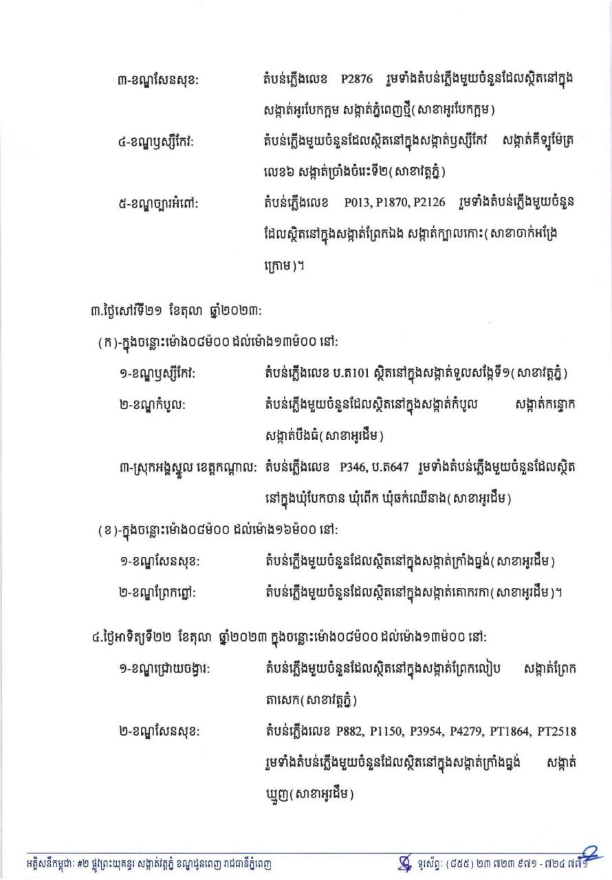 EDC ជូនដំណឹងពីការរអាក់រអួលចរន្ត ចាប់ពីថ្ងៃនេះដល់ថ្ងៃទី២២ ខែតុលា ដើម្បីរុះរើគន្លង ខ្សែបណ្តាញ ផ្លាស់ប្តូរ តម្លើងបរិក្ខារ ងាយស្រួល ដល់ការដ្ឋានពង្រីកផ្លូវ