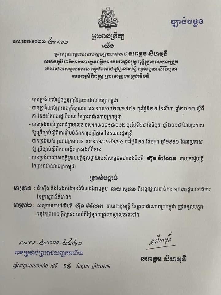 ព្រះមហាក្សត្រ ចេញព្រះរាជក្រឹត្យត្រាស់បង្គាប់ដំឡើង និងតែងតាំងមុខតំណែងលោក ឆាយ សុផល ជារដ្ឋលេខាធិការក្រសួងព័ត៌មាន