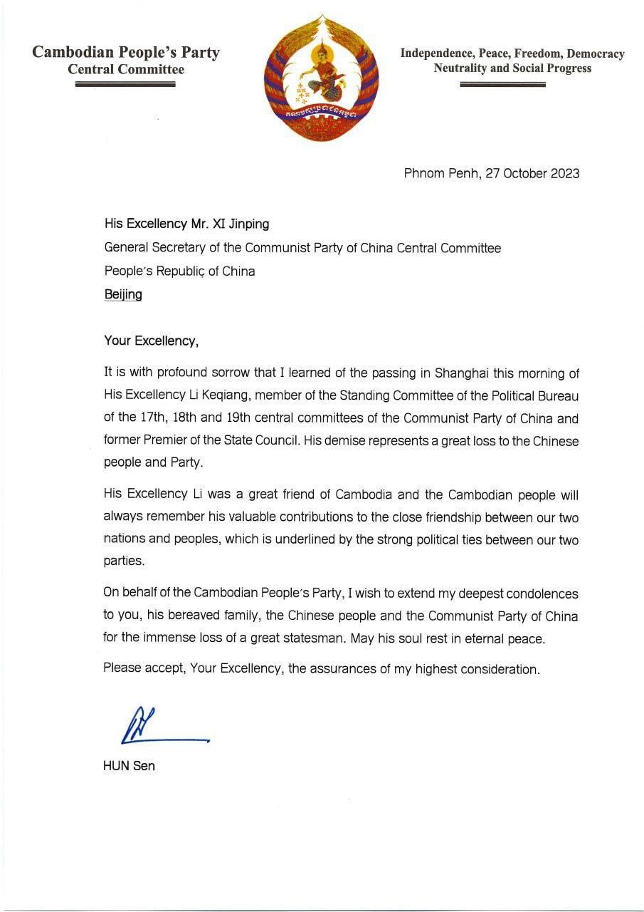 ក្នុងសារលិខិតនេះ សម្ដេចតេជោ ហ៊ុន សែន បានបញ្ជាក់ថា៖ ខ្ញុំមានសេចក្ដីក្រៀមក្រំជាទីបំផុត ដោយបានដឹងពីមរណភាពនៅទីក្រុងសៀងហៃ នៅព្រឹកមិញនេះ របស់ឯកឧត្តម Li Keqiang សមាជិកគណៈកម្មាធិការអចិន្ត្រៃយ៍នៃការិយាល័យនយោបាយនៃគណៈកម្មាធិការកណ្តាលទី១៧, ទី១៨ និងទី១៩ នៃបក្សកុម្មុយនិស្តចិន និងជាអតីតនាយករដ្ឋមន្ត្រីនៃក្រុមប្រឹក្សារដ្ឋ។ មរណភាពរបស់ឯកឧត្តម តំណាងឱ្យការបាត់បង់ដ៏ធំមួយសម្រាប់ប្រជាជនចិន និងបក្ស។